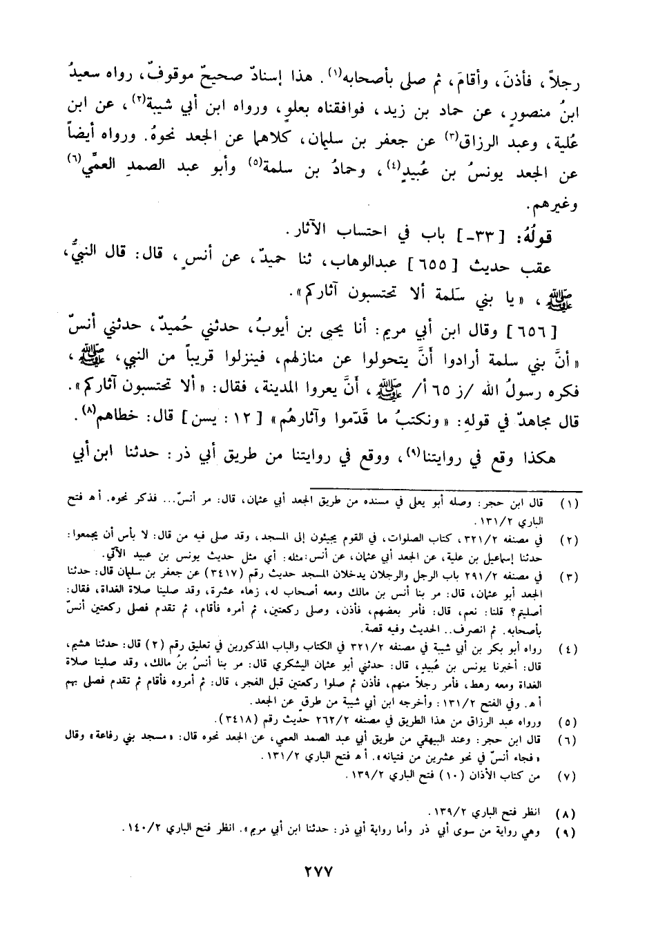 [656] وَقَالَ ابْن أبي مَرْيَم أَنا يحيى بن أَيُّوب حَدَّثَني حميد حَدَّثَني أَنَسٌ ((أَنَّ بَنِي سَلَمَةَ أَرَادُوا أَنْ يَتَحَوَّلُوا عَنْ مَنَازِلِهِمْ فَيَنْزِلُوا قَرِيبًا مِنَ النَّبِيِّ صَلَّى اللَّهُ عَلَيْهِ وَسَلَّمَ فَكَرِهَ رَسُولُ الله ز 65 أصَلَّى اللَّهُ عَلَيْهِ وَسَلَّمَ إِنَّ يعروا الْمَدِينَة فَقَالَ ((أَلا تحسبون آثَارَكُمْ)) قَالَ مُجَاهِد فِي قَوْله {ونكتب مَا قدمُوا وآثارهم} [12 يسن] قَالَ خطاهم