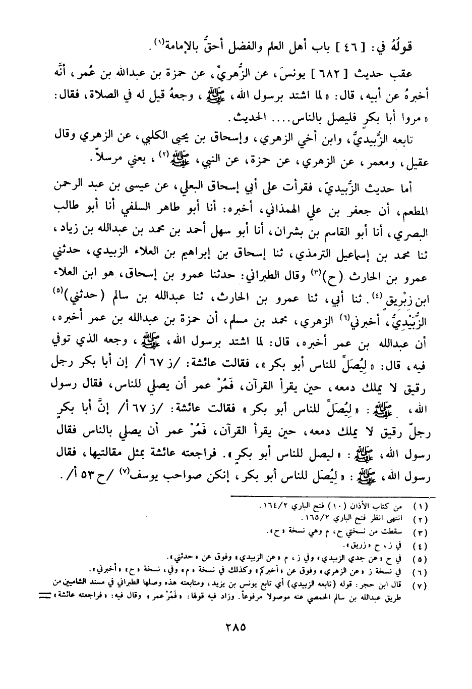 أما حَدِيث الزبيدِيّ فَقَرَأت على أبي إِسْحَاق البعلي عَن عِيسَى بن عبد الرَّحْمَن الْمطعم أَنَّ جَعْفَرَ بْنَ عَلِيٍّ الْهَمَذَانِيَّ أَخْبَرَهُ أَنا أَبُو طَاهِرٍ السِّلَفِيُّ أَنا أَبُو طَالب الْبَصْرِيّ أَنا أَبُو الْقَاسِم بن بَشرَان أَنا أَبُو سهل أَحْمد بن مُحَمَّد بْنُ عَبْدِ اللَّهِ بْنِ زِيَادٍ ثَنَا مُحَمَّد بن إِسْمَاعِيل التِّرْمِذِيّ ثَنَا إِسْحَاقُ بْنُ إِبْرَاهِيمَ بْنِ الْعَلَاء الزبيدِيّ حَدَّثَني عَمْرو بن الْحَارِث (ح) وَقَالَ الطَّبَرَانِيّ حَدَّثنا عَمْرو بن إِسْحَاق هُوَ ابْن الْعَلَاء ابْن زبريق ثَنَا أبي ثَنَا عَمْرو بن الْحَارِث ثَنَا عبد الله بن سَالم (حَدَّثَني) الزبيدِيّ أَخْبَرَنِي الزُّهْرِيّ مُحَمَّد بن مُسلم أَن حَمْزَةَ بْنِ عَبْدِ اللَّهِ بْنِ عمر أخبرهُ أَن عبد لله بن عمر أخبرهُ قَالَ لما اشْتَدَّ بِرَسُولِ اللَّهِ صَلَّى اللَّهُ عَلَيْهِ وَسلم وَجَعه الَّذِي توفّي فِيهِ قَالَ ((ليصل للنَّاس أَبُو بكر)) فَقَالَت عَائِشَة ز 67 أإِن أَبَا بكر رجل رَقِيق لَا يملك دمعه حِين يقْرَأ الْقُرْآن فَمر عمر أَن يُصَلِّي للنَّاس فَقَالَ رَسُول الله صلى الله عَلَيْهِ وَسلم ((ليصل للنَّاس أَبُو بكر)) فَقَالَت عَائِشَة ز 67 أإِن أَبَا بكر رجل رَقِيق لَا يملك دمعه حِين يقْرَأ الْقُرْآن فَمر عمر أَن يُصَلِّي للنَّاس فَقَالَ رَسُول الله صلى الله عَلَيْهِ وَسلم ((ليصل للنَّاس أَبُو بكر)) فراجعته عَائِشَة بِمثل مقالتيها فَقَالَ رَسُول الله صلى الله عَلَيْهِ وَسلم ((ليصل للنَّاس أَبُو بكر إنكن صَوَاحِب يُوسُف ح 53 أ