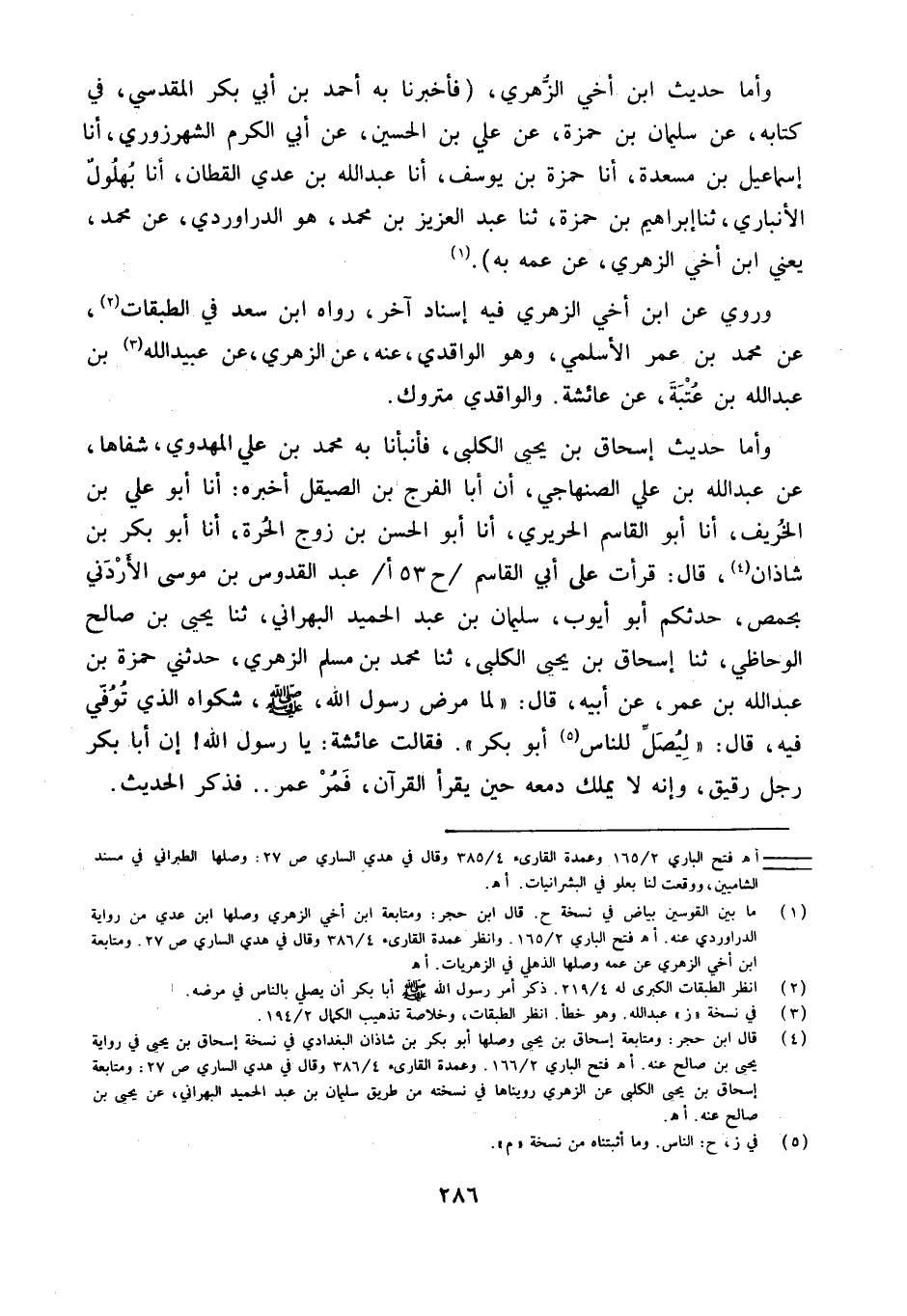 وَأما حَدِيث إِسْحَاق بن يحيى الْكَلْبِيّ فأنبأنا بِهِ مُحَمَّد بن عَليّ الْمَهْدَوِيّ شفاها عَن عبد الله عَليّ الصنهاجي أَن أَبَا الْفرج بن الصيقل أخبرهُ أَنا أَبُو عَليّ بن الخريف أَنا أَبُو الْقَاسِم الحريري أَنا أَبُو الْحسن بن زوج الْحرَّة أَنا أَبُو بكر بن شَاذان قَالَ قَرَأت على أبي الْقَاسِم ح 53 أعبد القدوس بن مُوسَى الأردني بحمص حَدثكُمْ أَبُو أَيُّوب سُلَيْمَان بن عبد الحميد البهراني ثَنَا يحيى بن صَالح الوحاظي ثَنَا إِسْحَاق بن يحيى الْكَلْبِيّ ثَنَا مُحَمَّد بن مُسلم الزُّهْرِيّ حَدَّثَني حَمْزَةَ بْنِ عَبْدِ اللَّهِ بْنِ عمر عَن أَبِيه قَالَ ((لما مرض رَسُول الله صلى الله عَلَيْهِ وَسلم شكواه الَّذِي توفّي فِيهِ قَالَ ((ليصل للنَّاس أَبُو بكر)) فَقَالَت عَائِشَة يَا رَسُول اللَّهِ إِنَّ أَبَا بَكْرٍ رَجُلٌ رَقِيق وَإنَّهُ لَا يملك دمعه حِين يقْرَأ الْقُرْآن فَمر عمر فَذكر الحَدِيث