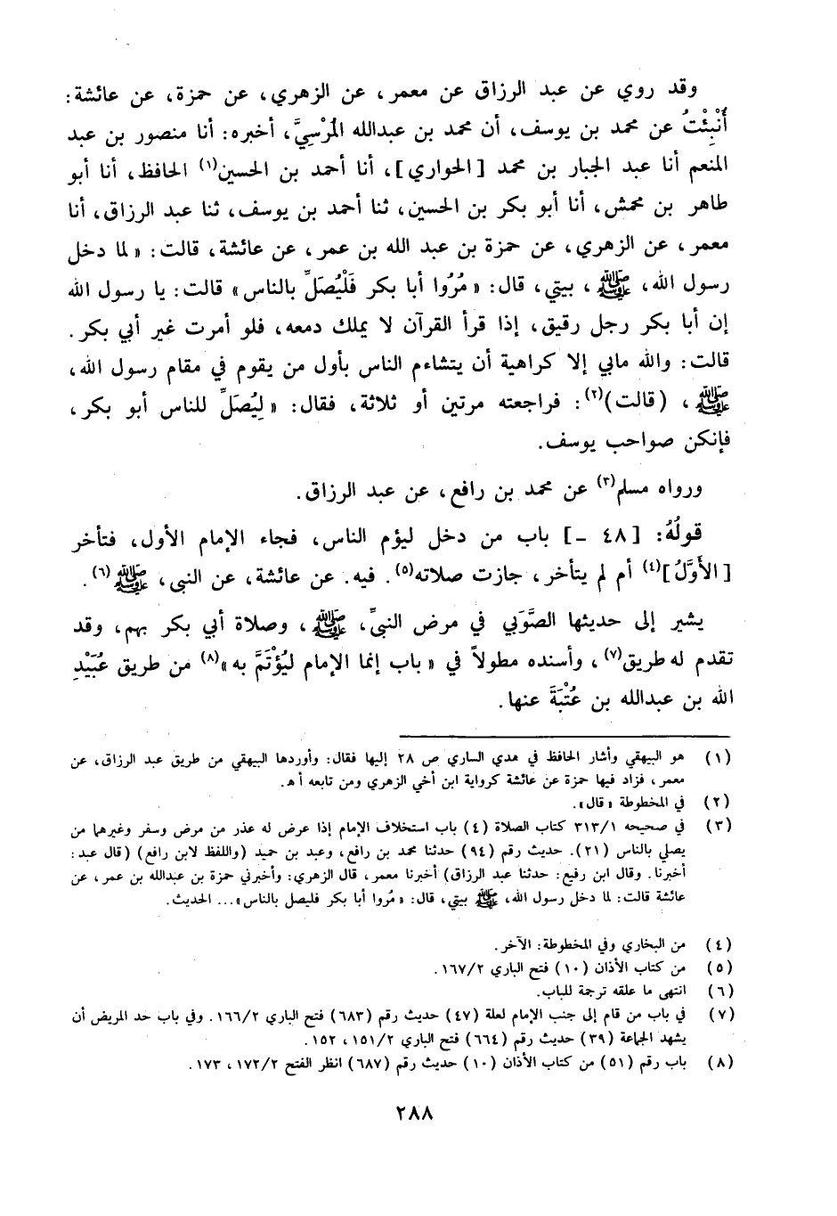 وَقَدْ رُوِيَ عَنْ عَبْدِ الرَّزَّاقِ بْنِ مَعْمَرٍ عَنِ الزُّهْرِيِّ عَنْ حَمْزَةَ عَنْ عَائِشَةَ أُنْبِئْتُ عَنْ مُحَمَّدِ بْنِ يُوسُفَ أَنَّ مُحَمَّدَ بْنَ عَبْدِ اللَّهِ الْمُرْسِيَّ أَخْبَرَهُ أَنا مَنْصُورُ بْنُ عَبْدِ الْمُنْعِمِ أَنا عَبْدُ الْجَبَّارِ بْنُ مُحَمَّدٍ [الْحَوَارِيُّ] أَنا أَحْمَدُ بْنُ الْحُسَيْنِ الْحَافِظُ أَنا أَبُو طَاهِرِ بْنُ مَحْمِشٍ أَنَّ أَبُو بَكْرِ بْنُ الْحُسَيْنِ ثَنَا أَحْمَدُ بْنُ يُوسُفَ ثَنَا عَبْدُ الرَّزَّاقِ أَنا مَعْمَرٌ عَنِ الزُّهْرِيِّ عَنْ حَمْزَةَ بْنِ عَبْدِ اللَّهِ بْنِ عُمَرَ عَنْ عَائِشَةَ قَالَتْ ((لَمَّا دَخَلَ رَسُولُ الله صلى الله عَلَيْهِ وَسلم بَيْتِي قَالَ ((مُرُوا أَبَا بَكْرٍ فَلْيُصَلِّ بِالنَّاسِ)) قَالَتْ يَا رَسُولَ اللَّهِ إِنَّ أَبَا بَكْرٍ رَجُلٌ رَقِيقٌ إِذَا قَرَأَ الْقُرْآنَ لَا يَمْلِكُ دَمْعَهُ فَلَوْ أَمَرْتَ غَيْرَ أَبِي بَكْرٍ قَالَتْ وَاللَّهِ مَا بِي إِلَّا كرهية أَنْ يَتَشَاءَمَ النَّاسُ بِأَوَّلِ مَنْ يَقُومُ فِي مَقَامِ رَسُولِ اللَّهِ صَلَّى اللَّهُ عَلَيْهِ وَسَلَّمَ (قَالَتْ) فراجعته مرَّتَيْنِ أَو ثَلَاثَة فَقَالَ ((لِيُصَلِّ لِلنَّاسِ أَبُو بَكْرٍ فَإِنَّكُنَّ صَوَاحِبُ يُوسُفَ