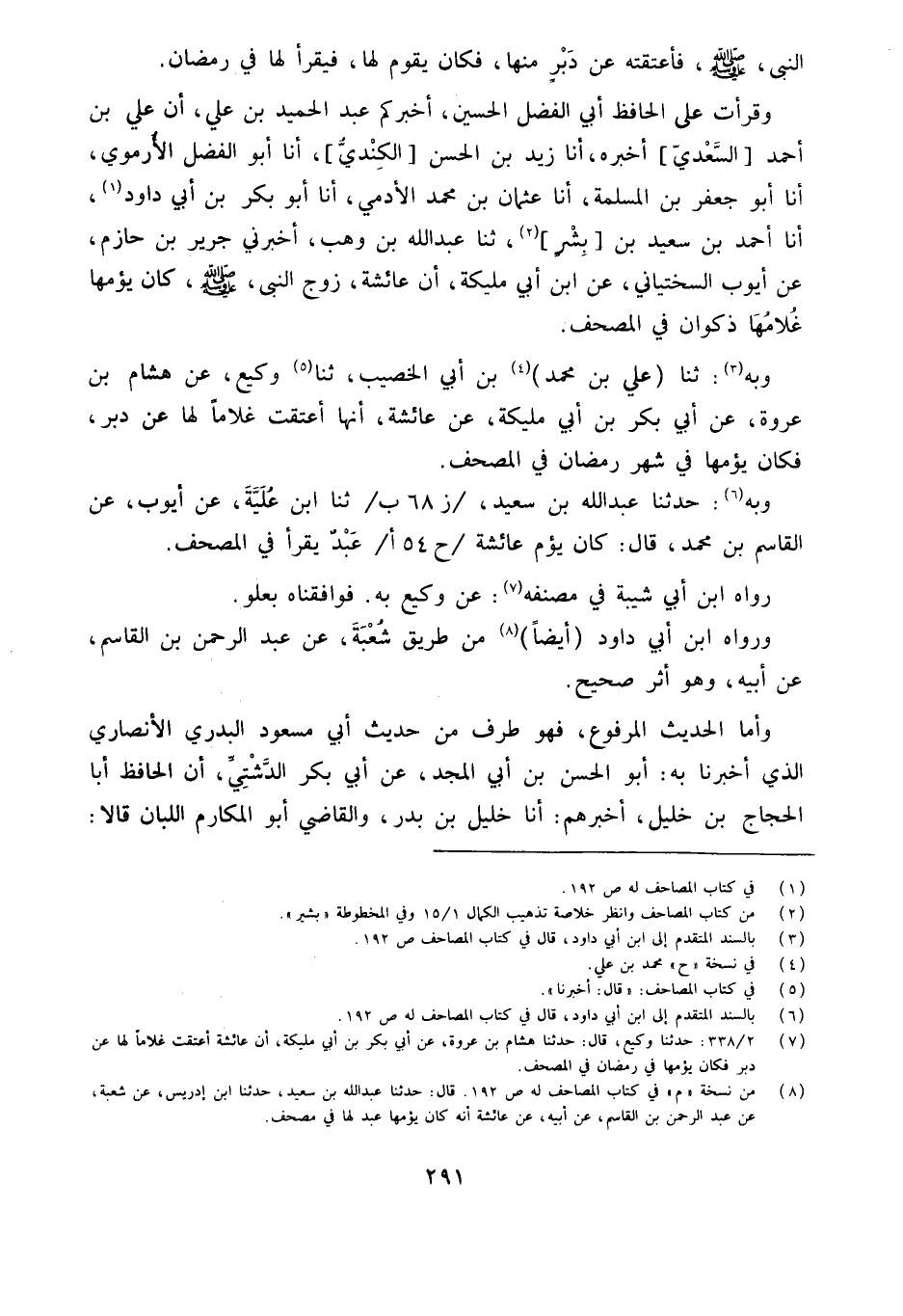 وَقرأت عَلَى الْحَافِظِ أَبِي الْفَضْلِ الْحُسَيْنِ أَخْبَرَكُمْ عَبْدُ الْحَمِيدِ بْنُ عَلِيٍّ أَنَّ عَلِيَّ بْنَ أَحْمَدَ [السَّعْدِيَّ] أَخْبَرَهُ أَنا زَيْدُ بْنُ الْحَسَنِ [الْكِنْدِيُّ] أَنا أَبُو الْفَضْلِ الأُرْمَوِيُّ أَنا أَبُو جَعْفَرِ بْنُ الْمُسْلِمَةِ أَنا عُثْمَانُ بْنُ مُحَمَّدٍ الأَدَمِيُّ أَنا أَبُو بَكْرِ بْنُ أَبِي دَاوُدَ أَنا أَحْمَدُ بْنُ سَعِيدِ بْنِ بِشْرٍ ثَنَا عَبْدُ اللَّهِ بْنُ وَهْبٍ أَخْبَرَنِي جَرِيرُ بْنُ حَازِمٍ عَنْ أَيُّوبَ السَّخْتِيَانِيِّ عَنِ ابْنِ أَبِي مُلَيْكَةَ أَنَّ عَائِشَةَ زَوْجَ النَّبِيِّ صَلَّى اللَّهُ عَلَيْهِ وَسَلَّمَ كَانَ يَؤُمُّهَا غُلامُهَا ذَكْوَانُ فِي الْمُصْحَفِ