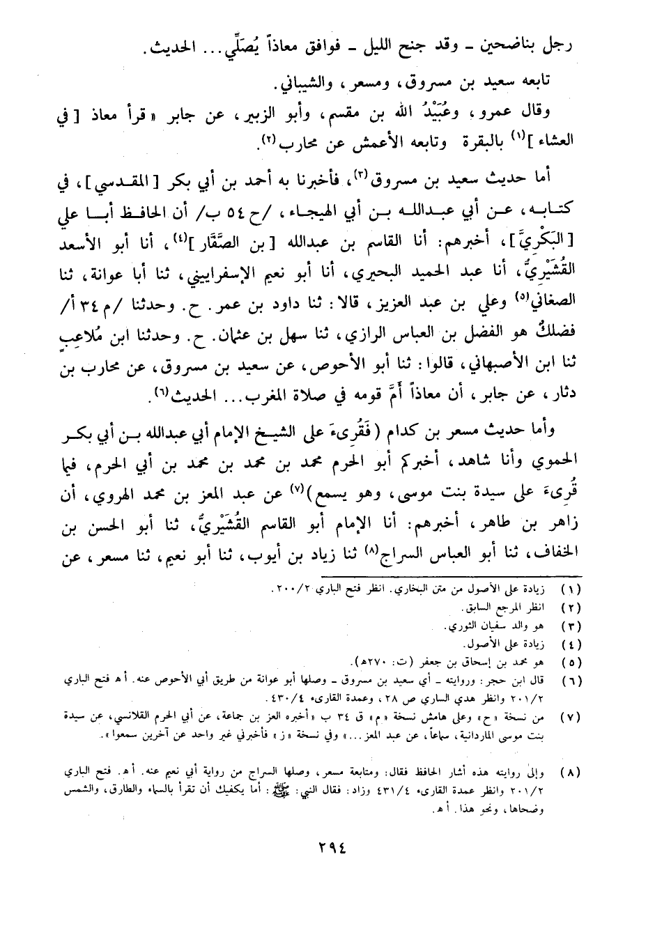 أما حَدِيث سعيد ين مَسْرُوق فأَخْبَرَنَا بِهِ أَحْمد بن أَبِي بَكْرٍ [الْمَقْدِسِيُّ] فِي كِتَابِهِ عَنْ أَبِي عَبْدِ اللَّهِ بْنِ أبي الهيجاء ح 54 ب أَن الْحَافِظ أَبَا عَليّ [الْبكْرِيّ] أخْبرهُم أَنا الْقَاسِم بن عبد الله [بن الصفار] أَنا أَبُو الأسعد الْقشيرِي أَنا عبد الحميد الْبُحَيْرِي أَنا أَبُو نعيم الإِسْفِرَايِينِيّ ثَنَا أَبُو عوَانَة ثَنَا الصغاني وَعلي بن عبد الْعَزِيز قَالَا ثَنَا دَاوُد بن عمر وحَدَّثنا م 34 أفضلك هُوَ الْفضل بن الْعَبَّاس الرَّازِيّ ثَنَا سهل بن عُثْمَان ح وحَدَّثنا ابْن ملاعب ثَنَا ابْن الْأَصْبَهَانِيّ قَالُوا ثَنَا أَبُو الْأَحْوَص عَن سعيد بن مَسْرُوق عَن محَارب بن دثار عَن جَابر أَن معَاذًا أم قومه فِي صَلَاة الْمغرب الحَدِيث