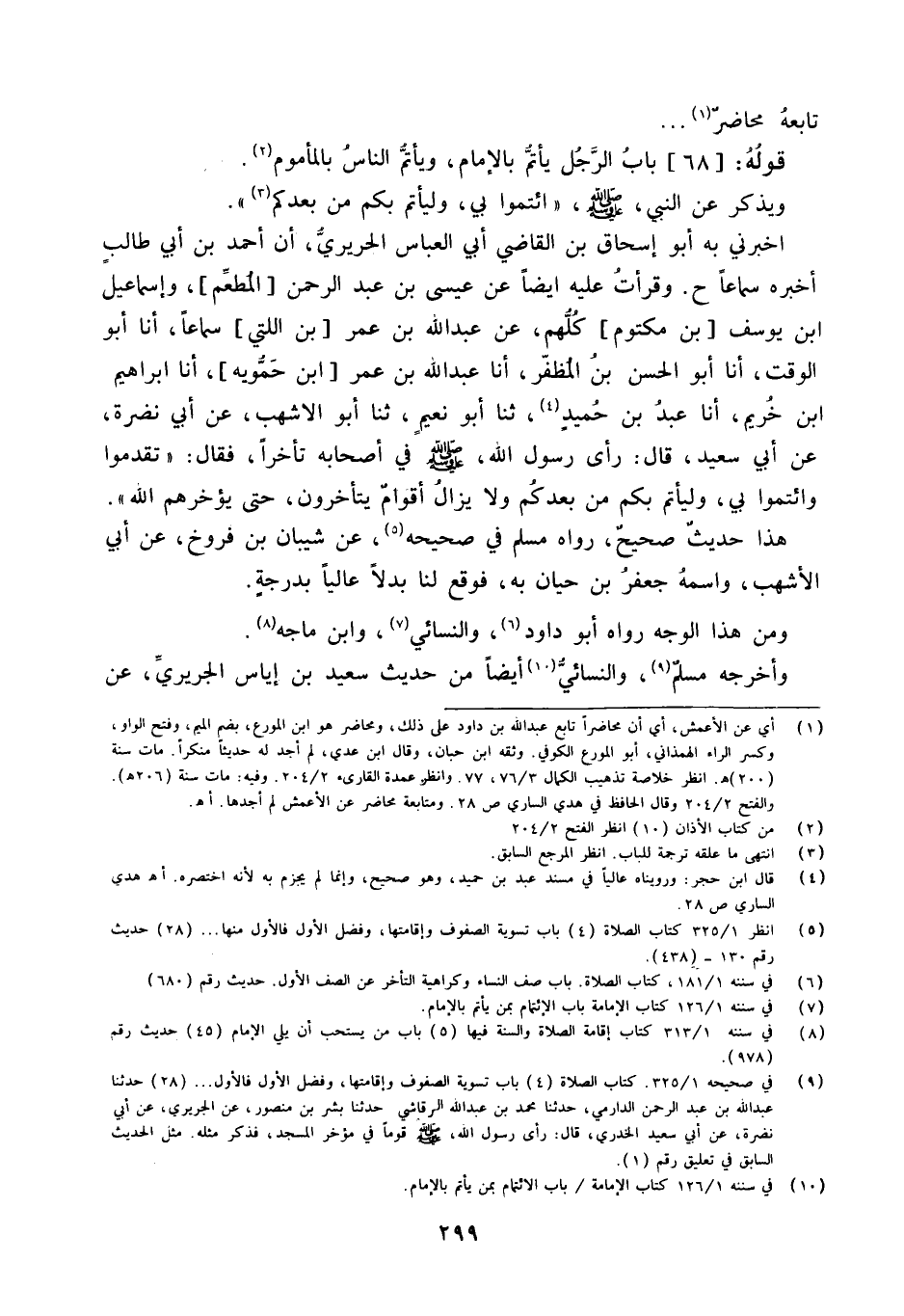أَخْبَرَنِي بِهِ أَبُو إِسْحَاقَ بْنُ الْقَاضِي أَبِي الْعَبَّاسِ الْحَرِيرِيُّ أَنَّ أَحْمَدَ بْنَ أَبِي طَالِبٍ أَخْبَرَهُ سَمَاعًا ح وَقرأت عَلَيْهِ أَيْضًا عَنْ عِيسَى بْنِ عَبْدِ الرَّحْمَنِ [الْمُطْعِمِ] وَإِسْمَاعِيلَ ابْن يُوسُفَ [بْنِ مَكْتُومٍ] كُلُّهُمْ عَنْ عبد الله بن عمر [بن اللَّتِّيِّ] سَمَاعًا أَنا أَبُو الْوَقْتِ أَنا أَبُو الْحسن بن المظفر أَنا عَبْدُ اللَّهِ بْنُ عُمَرَ [ابْن حمويه] أَنا إِبْرَاهِيم ابْن خُرَيْمٍ أَنا عَبْدُ بْنُ حُمَيْدٍ ثَنَا أَبُو نُعَيْمٍ ثَنَا أَبُو الأَشْهَبِ عَنْ أَبِي نَضْرَةَ عَنْ أَبِي سَعِيدٍ قَالَ رَأَى رَسُولُ الله صلى الله عَلَيْهِ وَسلم فِي أَصْحَابِهِ تَأَخُّرًا فَقَالَ ((تَقَدَّمُوا وَائْتَمُّوا بِي وَلْيَأْتَمَّ بِكُمْ مَنْ بَعْدَكُمْ وَلا يَزَالُ أَقْوَامٌ يَتَأَخَّرُونَ حَتَّى يؤخؤهم اللَّهُ))