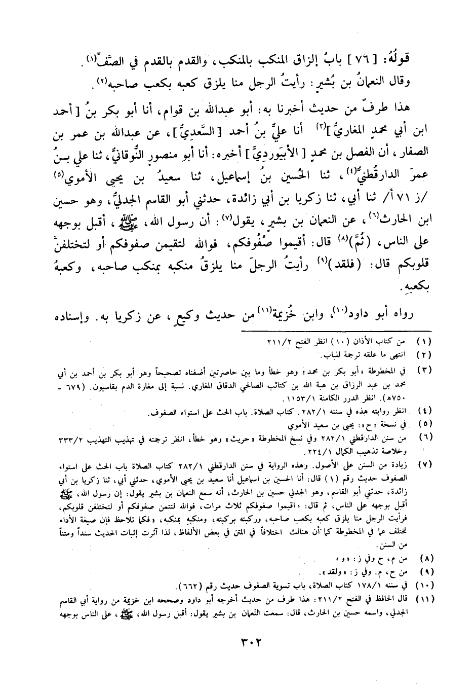 هَذَا طرف من حَدِيث أَخْبَرَنَا بِهِ أَبُو عَبْدِ اللَّهِ بْنُ قَوَّامٍ أَنا أَبُو بَكْرِ بْنُ [أَحْمد ابْن أبي مُحَمَّد المغاري] أَنا عَليّ بْنَ أَحْمَد [السَّعْدِيَّ] عَنْ عَبْدِ اللَّهِ بْنِ عُمَرَ بْنِ الصَّفَّارِ أَن الْفَصْل بْنَ مُحَمَّدٍ [الأَبِيوَرْدِيَّ] أَخْبَرَهُ أَنا أَبُو مَنْصُورٍ النَّوْقَانِيُّ ثَنَا عَلِيُّ بْنُ عُمَرَ الدَّارَقُطْنِيُّ ثَنَا الْحُسَيْنُ بْنُ إِسْمَاعِيلَ ثَنَا سَعِيدُ بْنُ يحيى الْأمَوِي ز 71 أثَنَا أَبِي ثَنَا زَكَرِيَّا بْنُ أَبِي زَائِدَةَ حَدَّثَني أَبُو الْقَاسِمِ الجدلي وهوحسين ابْن الْحَارِثِ عَنِ النُّعْمَانِ بْنِ بَشِيرٍ يَقُول إِن رَسُول الله صلى اللَّهُ عَلَيْهِ وَسَلَّمَ أَقْبَلَ بِوَجْهِهِ عَلَى النَّاسِ (ثُمَّ) قَالَ أَقِيمُوا صُفُوفَكُمْ فَوَاللَّهِ لَتُقِيمُنَّ صُفُوفَكُمْ أَوْ لَتَخْتَلِفَنَّ قُلُوبُكُمْ قَالَ (فَلَقَدْ) رَأَيْتُ الرَّجُلَ مِنَّا يَلْزَقُ مَنْكِبَهُ بِمَنْكِبِ صَاحِبِهِ وَكَعْبَهُ بِكَعْبِهِ