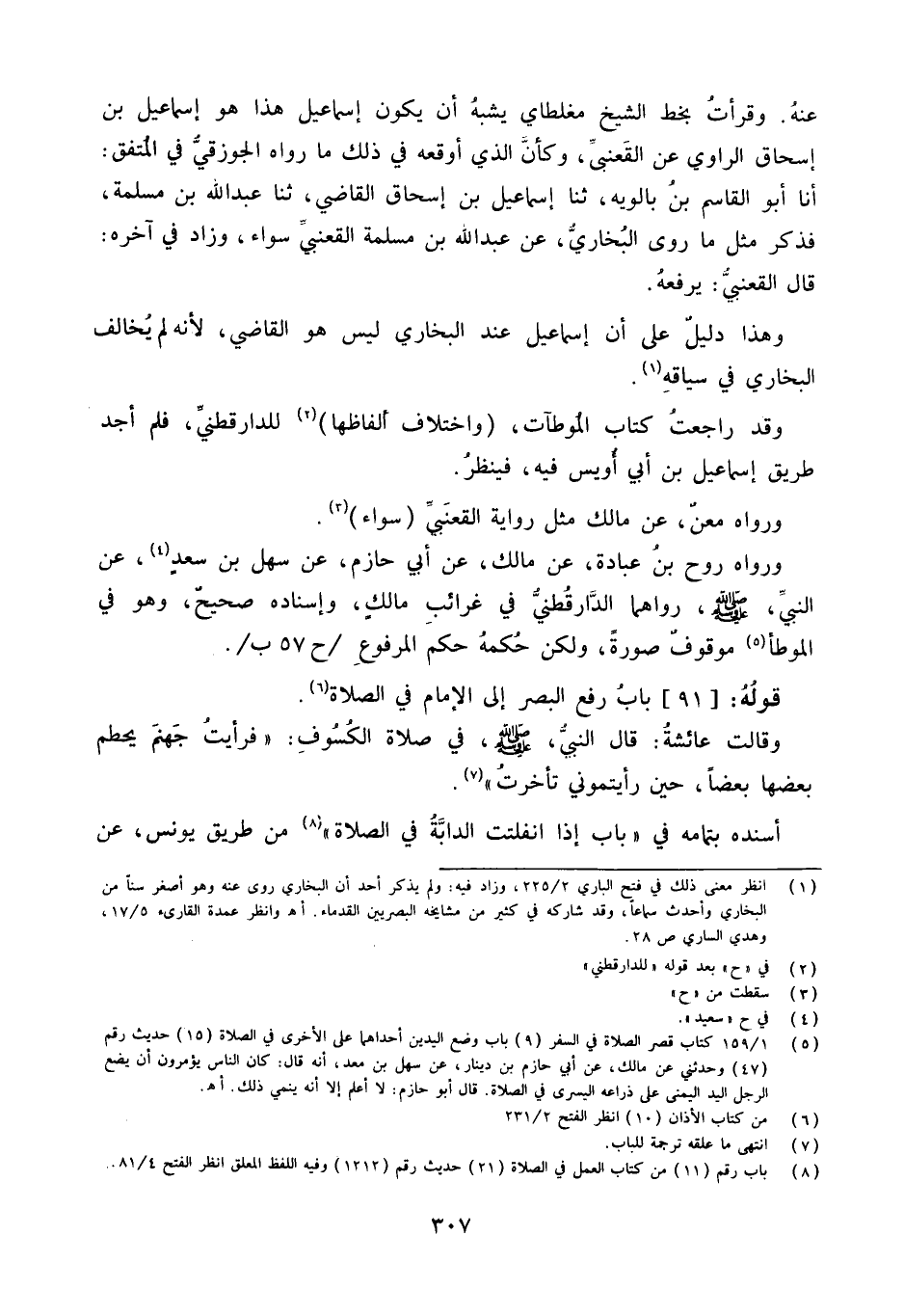 عَنهُ وقرأت بِخَط الشَّيْخ مغلطاي يشبه أَن يكون إِسْمَاعِيل هَذَا هُوَ إِسْمَاعِيل بن إِسْحَاق الرَّاوِي عَن القعْنبِي وَكَأن الَّذِي أوقعه فِي ذَلِك مَا رَوَاهُ الجوزقي فِي الْمُتَّفق أَنا أَبُو الْقَاسِم بن بَالَوَيْهِ ثَنَا إِسْمَاعِيل بن إِسْحَاق القَاضِي ثَنَا عبد الله بن مسلمة فَذكر مثل مَا روى البُخَارِيّ عَن عبد الله بن مسلمة القعْنبِي سَوَاء وَزَاد فِي آخِره قَالَ القعْنبِي يرفعهُ