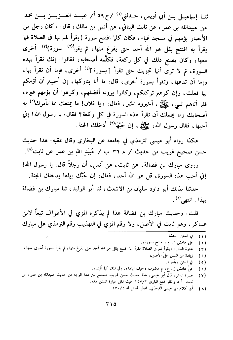 ثَنَا إِسْمَاعِيلُ بْنُ أَبِي أُوَيْسٍ حَدثنِي ح 59 أعبد العزبز بن مُحَمَّد عَن عبيد الله بن عمر عَن ثَابت الْبنانِيّ عَنْ أَنَسِ بْنِ مَالِكٍ قَالَ ((كَانَ رجل من الْأَنْصَار يؤهم فِي مَسْجِد قبَاء فَكَانَ كلما افْتتح سُورَة (يقْرَأ لَهُم بهَا فِي الصَّلَاة فِيمَا يقْرَأ بِهِ افْتتح بقل هُوَ اللَّهُ أَحَدٌ حَتَّى يفرغ مِنْهَا ثُمَّ يَقْرَأُ سُورَةً) أُخْرَى مَعهَا وَكَانَ يصنع ذَلِك فِي كل رَكْعَة فَكَلمهُ أَصْحَابه فَقَالُوا إِنَّك تقْرَأ بِهَذِهِ السُّورَة ثمَّ لَا ترى أَنَّهَا تجزيك حَتَّى تقْرَأ [بِسُورَة] أُخْرَى فإمَّا أَن تقْرَأ بهَا وَإِمَّا أَن تدعها وتقرأ بِسُورَة أُخْرَى قَالَ مَا أَنا بتاركها إِن أَحْبَبْتُم أَن أؤمكم بهَا فعلت وَإِن كرهتم تركتكم وَكَانُوا يورنه أفضلهم وكرهوا أَن يؤمهم غَيره فَلَمَّا أَتَاهُم النَّبِي صلى الله عَلَيْهِ وَسلم أَخْبرُوهُ الْخَبَر فَقَالَ ((يَا فلَان مَا يمنعك مِمَّا يمنعك بِهِ أَصْحَابك وَمَا يحملك أَن تقْرَأ هَذِه السُّورَة فِي كل رَكْعَة فَقَالَ يَا رَسُول الله إِنِّي أحبها فَقَالَ رَسُول الله صلى الله عَلَيْهِ وَسلم إِن حبها أدْخلك الْجنَّة