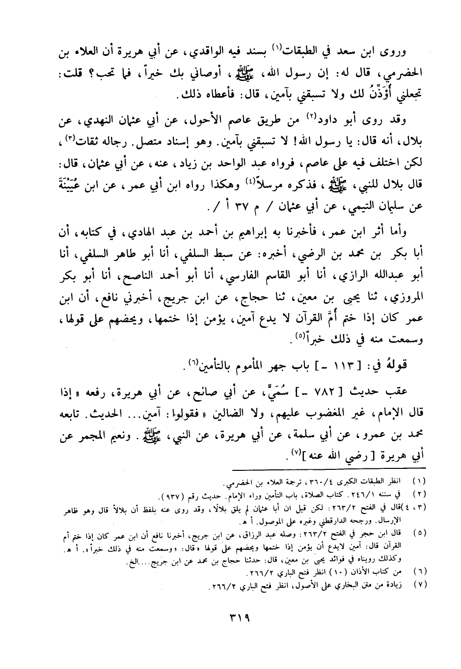 وَأما أثر ابْن عمر فَأخبرنا بِهِ إِبْرَاهِيم بن أَحْمد بن عبد الْهَادِي فِي كِتَابِهِ أَنَّ أَبَا بَكْرِ بْنَ مُحَمَّدِ بْنِ الرَّضِيِّ أَخْبَرَهُ عَنْ سِبْطِ السِّلَفِيِّ أَنا أَبُو طَاهِرٍ السِّلَفِيُّ أَنا أَبُو عَبْدِ اللَّهِ الرَّازِيُّ أَنا أَبُو الْقَاسِمِ الْفَارِسِيُّ أَنا أَبُو أَحْمَدَ النَّاصِحُ أَنا أَبُو بَكْرٍ الْمَرْوَزِيُّ ثَنَا يَحْيَى بْنُ مَعِينٍ ثَنَا الْحَجَّاجُ عَن ابْن جريج أَخْبَرَنِي نَافِع أَنَّ ابْنَ عُمَرَ كَانَ إِذَا خَتَمَ الْقُرْآنَ لَا يَدَعُ آمِينَ يُؤَمِّنُ إِذَا خَتَمَهَا وَيَحُضُّهُمْ عَلَى قَوْلِهَا وَسمعت مِنْهُ فِي ذَلِك خَبرا