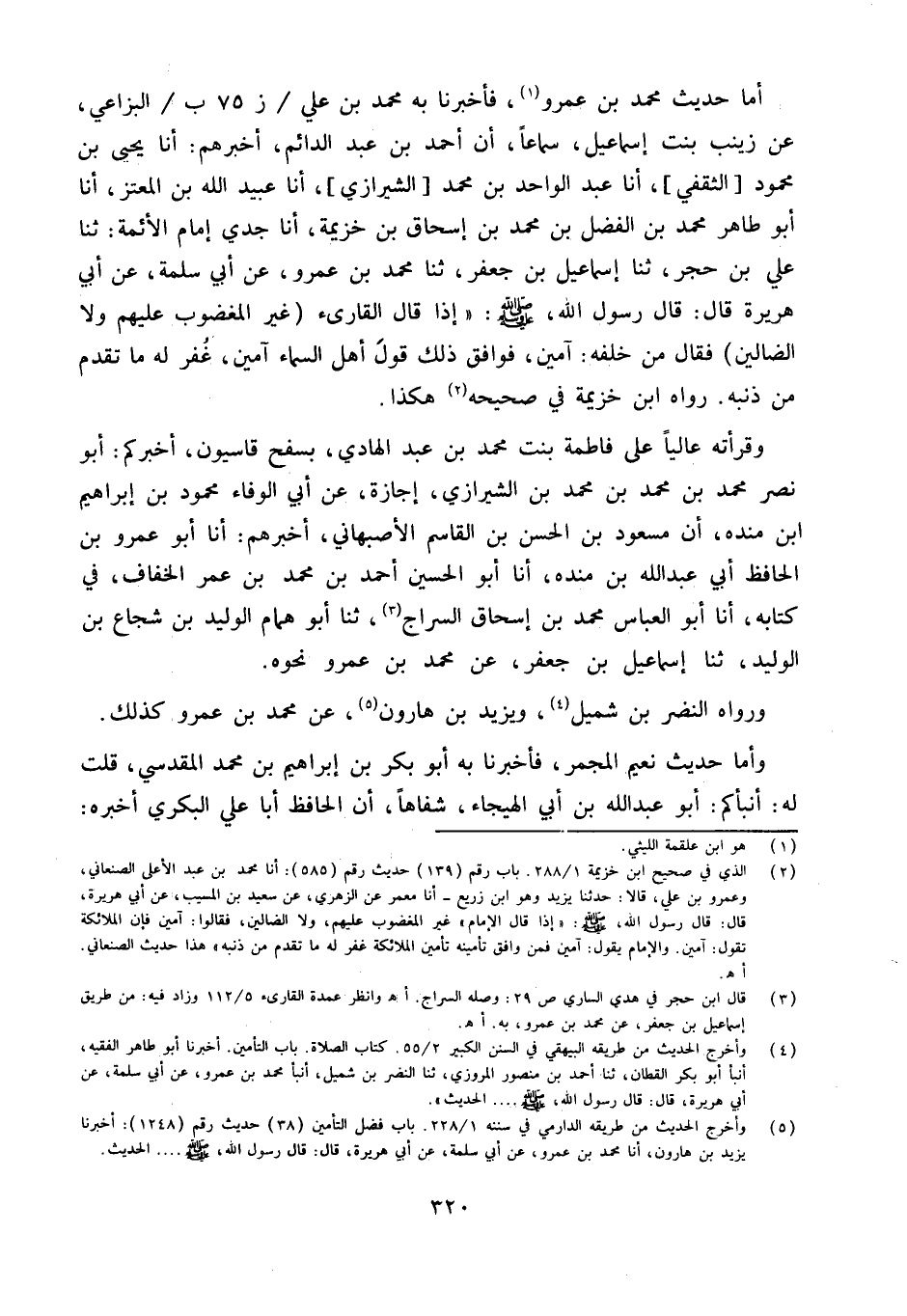 أما حَدِيث مُحَمَّد بن عَمْرو فَأَخْبَرَنَا بِهِ مُحَمَّدُ بْنُ عَلِيٍّ ز 75 ب الْبُزَاعِيُّ عَنْ زَيْنَبَ بِنْتِ إِسْمَاعِيلَ سَمَاعًا أَنَّ أَحْمَدَ بْنَ عَبْدِ الدَّائِمِ أَخْبَرَهُمْ أَنا يَحْيَى بْنُ مَحْمُودٍ [الثَّقَفِيُّ] أَنا عَبْدُ الْوَاحِدِ بْنُ مُحَمَّدٍ [الشِّيرَازِيُّ] أَنا عُبَيْدُ اللَّهِ بْنُ الْمُعْتَزِّ أَنا أَبُو طَاهِر مُحَمَّد بن الْفضل بن مُحَمَّدِ بْنِ إِسْحَاقَ بْنِ خُزَيْمَةَ أَنا جَدِّي إِمَامُ الأَئِمَّةِ ثَنَا عَلِيُّ بْنُ حُجْرٍ ثَنَا إِسْمَاعِيلُ بْنُ جَعْفَرٍ ثَنَا مُحَمَّدُ بْنُ عَمْرو عَن أبي سَلمَة عَن أبي هُرَيْرَة قَالَ قَالَ رَسُول الله صلى الله عَلَيْهِ وَسلم ((إِذَا قَالَ الْقَارِئُ {غَيْرِ الْمَغْضُوبِ عَلَيْهِم وَلَا الضَّالّين} ) فَقَالَ مَنْ خَلْفَهُ آمِينَ فَوَافَقَ ذَلِكَ قَوْلَ أَهْلِ السَّمَاءِ آمِينَ غُفِرَ لَهُ مَا تَقَدَّمَ مِنْ ذَنْبِهِ رَوَاهُ ابْن خُزَيْمَة فِي صَحِيحه هَكَذَا