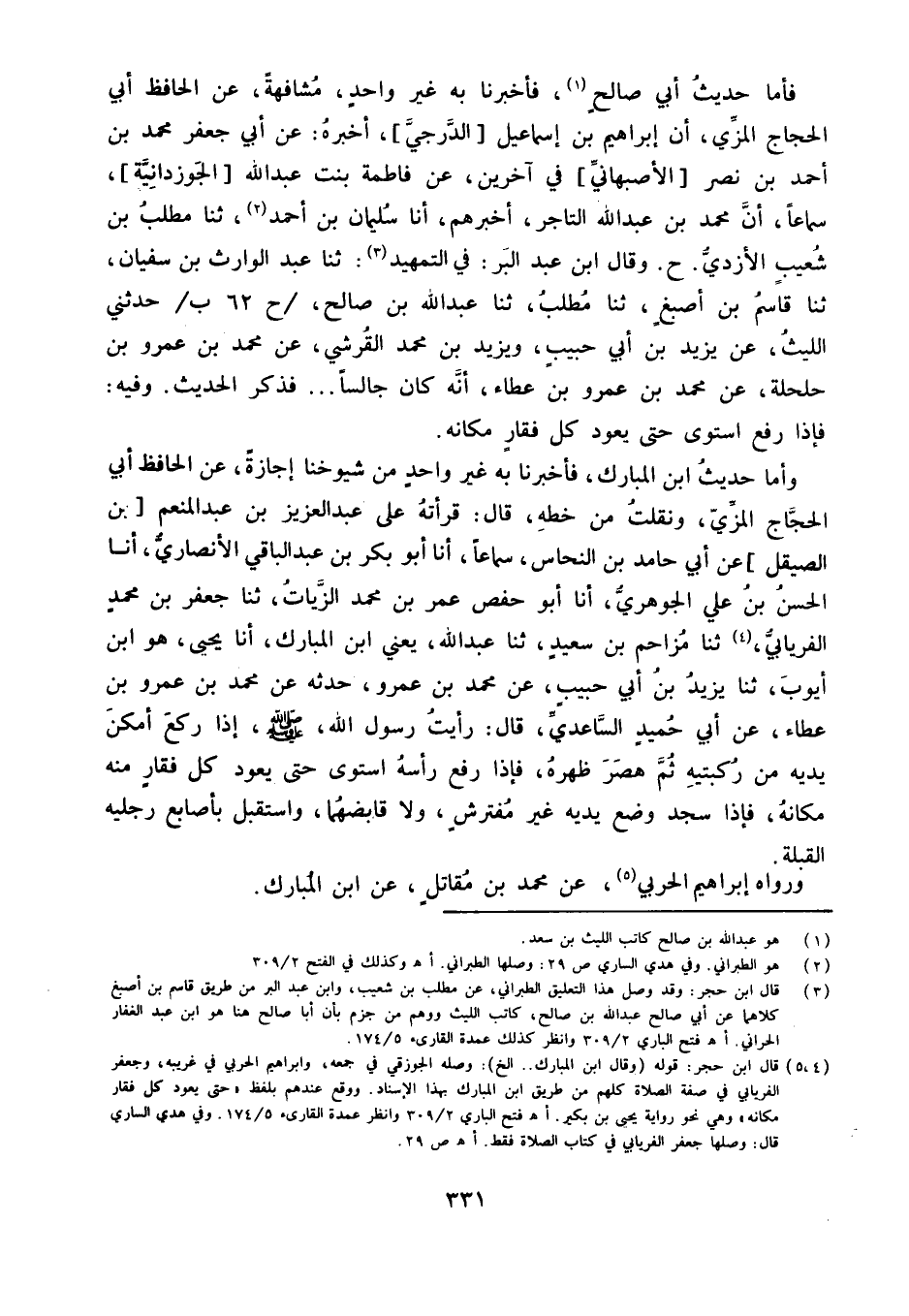 فَأَما حَدِيث أبي صَالح فأَخْبَرَنَا بِهِ غير وَاحِد مشافهة عَن الْحَافِظ أبي الْحجَّاج الْمزي أَن إِبْرَاهِيم بن إِسْمَاعِيل [الدرجي] أخبرهُ عَنْ أَبِي جَعْفَرٍ مُحَمَّدِ بْنِ أَحْمد بن نصر [الْأَصْبَهَانِيّ] فِي آخَرين عَن فَاطِمَة بنت عبد الله [الجوزدانية] سَمَاعا أَن مُحَمَّد بن عبد الله التَّاجِر أخْبرهُم أَنا سُلَيْمَانُ بْنُ أَحْمَدَ ثَنَا مطلب بن شُعَيْب الْأَزْدِيّ ح وَقَالَ ابْن عبد الْبر فِي التَّمْهِيد ثَنَا عبد الْوَارِث بن سُفْيَان ثَنَا قَاسم بن أصيغ ثَنَا مطلب ثَنَا عبد الله بن صَالح ح 62 ب حَدَّثَني اللَّيْث عَن يزِيد بن أَبِي حَبِيبٍ وَيَزِيدَ بْنِ مُحَمَّدٍ الْقرشِي عَن مُحَمَّد بن عَمْرو بْنِ حَلْحَلَةَ عَنْ مُحَمَّدِ بْنِ عَمْرِو بْنِ عَطَاءٍ أَنَّهُ كَانَ جَالِسا فَذكر الحَدِيث وَفِيه فَإِذا رفع اسْتَوَى حَتَّى يعود كل فقار مَكَانَهُ