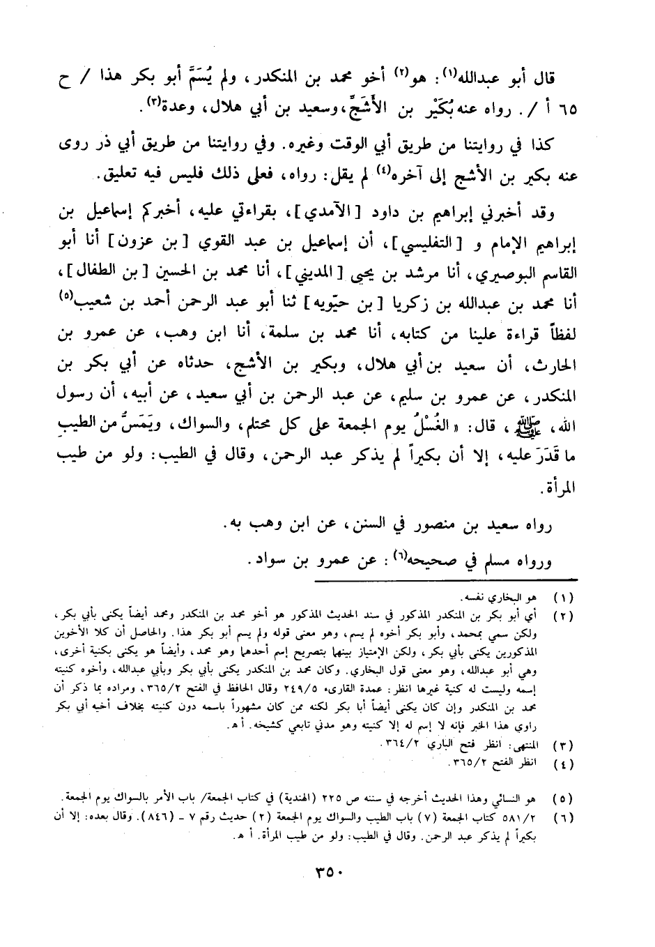 وَقد أَخْبَرَنِي إِبْرَاهِيم بن دَاوُد [الْآمِدِيّ] بِقِرَاءَتِي عَلَيْهِ أخْبركُم إِسْمَاعِيل بن إِبْرَاهِيم الإِمَام [والتفليسي] أَن إِسْمَاعِيل بن عبد الْقوي [بن عزون] أَنا أَبُو الْقَاسِم البوصيري أَنا مُرْشِدُ بْنُ يَحْيَى [الْمَدِينِيُّ] أَنا مُحَمَّد بن الْحُسَيْن [بن الطفال] أَنا مُحَمَّد بن عبد الله بن زَكَرِيَّا [بن حيويه] ثَنَا أَبُو عبد الرَّحْمَن أَحْمد بن شُعَيْب لفظا قِرَاءَة علينا من كِتَابه أَنا مُحَمَّد بن سَلمَة أَنا ابْن وهب عَن عَمْرو بن الْحَارِث أَن سعيد بن أبي هِلَال وَبُكَيْر بن الْأَشَج حَدَّثَاهُ عَن أبي بكر بن الْمُنْكَدِرِ عَنْ عَمْرِو بْنِ سُلَيْمٍ عَن عبد الرَّحْمَن بن أبي سعيد عَن أَبِيه أَن رَسُول الله صلى الله عَلَيْهِ وَسلم قَالَ ((الْغسْل يَوْم الْجُمُعَة على كل محتلم والسواك ويمس من الطّيب مَا قدر عَلَيْهِ إِلَّا أَن بكيرا لم يذكر عبد الرَّحْمَن وَقَالَ فِي الطّيب وَلَو من طيب الْمَرْأَة