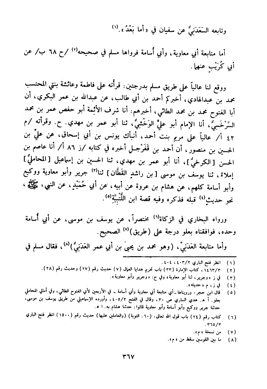 وَوَقع لنا عَالِيا على طَرِيق مُسلم بدرجتين قرأته على فَاطِمَة وَعَائِشَة بِنْتي الْمُحْتَسب مُحَمَّد بن عبد الْهَادِي أخْبركُم أَحْمد بن أبي طَالب عَن عبد الله بن عمر الْبكْرِيّ أَن أَبَا الْفتُوح مُحَمَّد بن مُحَمَّد الطَّائِي أخْبرهُم أَنا شرف الْأَئِمَّة أَبُو حَفْص عمر بن مُحَمَّد السَّرخسِيّ أَنا الإِمَام أَبُو عَليّ الوخشي ثَنَا أَبُو عمر بن مهْدي ح وقرأته م 42 أعَالِيا على مَرْيَم بنت أَحْمد أَنْبَأَك يُونُس بن أبي إِسْحَاق عَن عَليّ بن الْحُسَيْن بن مَنْصُور أَن أَحْمد بن قفرجل أخبرهُ فِي كِتَابه ز 86 أأَنا عَاصِم بن الْحسن [الْكَرْخِي] أَنا أَبُو عُمَرَ بْنُ مَهْدِيٍّ ثَنَا الْحُسَيْن بن إِسْمَاعِيل [الْمحَامِلِي] إملاء ثَنَا يُوسُف بن مُوسَى [بن رَاشد الْقطَّان] ثَنَا جرير وَأَبُو مُعَاوِيَة ووكيع وَأَبُو أُسَامَة كلهم عَن هِشَام بن عُرْوَة عَنْ أَبِيهِ عَنْ أَبِي حُمَيْدٍ عَن النَّبِي صلى الله عَلَيْهِ وَسلم نَحْو حَدِيث قبله فَذكره وَفِيه قصَّة ابْن اللتبية