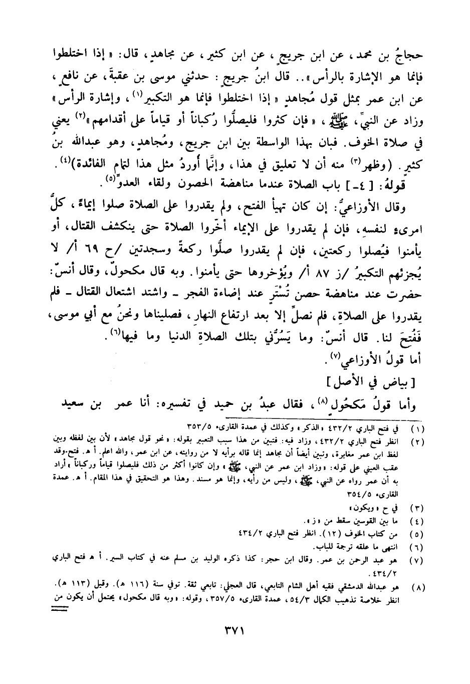 حجاج بن مُحَمَّد عَن ابْن جريج عَن ابْن كثير عَن مُجَاهِد قَالَ ((إِذا اختلطوا فَإِنَّمَا هُوَ الْإِشَارَة بِالرَّأْسِ)) قَالَ ابْن جريج حَدَّثَني مُوسَى بن عقبَة عَن نَافِع عَن ابْن عمر بِمثل قَول مُجَاهِد ((إِذا اختلطوا فَإِنَّهُ التَّكْبِير وَإِشَارَة الرَّأْس)) وَزَاد عَن النَّبِي صلى الله عَلَيْهِ وَسلم ((فَإِن كَثُرُوا فليصلوا ركبانا أَو قِيَاما على أَقْدَامهم)) يَعْنِي فِي صَلَاة الْخَوْف فَبَان بِهَذَا الْوَاسِطَة بَين ابْن جريج وَمُجاهد وَهُوَ عبد الله بن كثير (وَظهر مِنْهُ أَن لَا تَعْلِيق فِي هَذَا وأنما أورد مثل هَذَا لتَمام الْفَائِدَة)