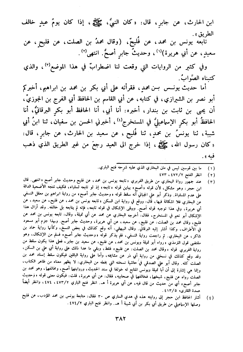 أما حَدِيث يُونُس بن مُحَمَّد فَقَرَأته على أبي بكر بن مُحَمَّد بن إِبْرَاهِيم أخْبركُم أَبُو نَصْرِ بْنُ الشِّيرَازِيِّ فِي كِتَابِهِ عَن أبي الْقَاسِم بن الْحَافِظ أَبِي الْفَرَجِ بْنِ الْجَوْزِيِّ أَنَّ يَحْيَى بْنُ ثَابِتِ بْنِ بُنْدَارٍ أَخْبَرَهُ أَنا أَبِي أَنا الْحَافِظُ أَبُو بكر البرقاني أَنا الْحَافِظ أَبُو بَكْرٍ الإِسْمَاعِيلِيُّ فِي الْمُسْتَخْرَجِ أَخْبَرَنِي الْحسن بن سُفْيَان ثَنَا ابْنُ أَبِي شَيْبَةَ ثَنَا يُونُسُ بْنُ مُحَمَّدٍ ثَنَا فُلَيْحٌ عَنْ سَعِيدِ بْنِ الْحَارِثِ عَنْ جَابِرٍ قَالَ ((كَانَ رَسُولُ اللَّهِ صَلَّى اللَّهُ عَلَيْهِ وَسَلَّمَ إِذَا خَرَجَ إِلَى الْعِيدِ رَجَعَ مِنْ غَيْرِ الطَّرِيق الَّذِي ذهب فِيهِ))