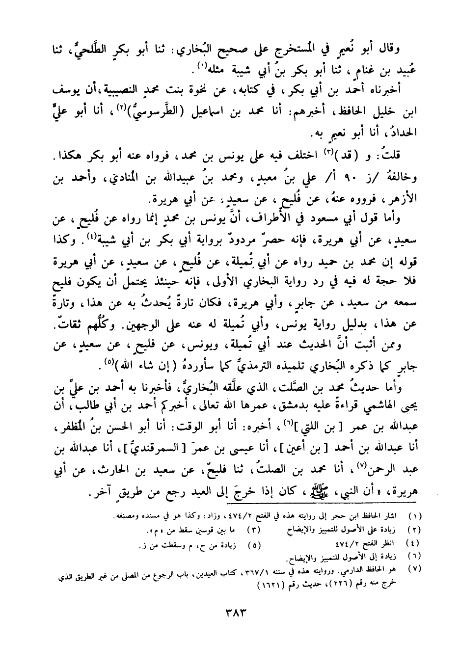 وَأما قَول أبي سعيد فِي الْأَطْرَاف أَن يُونُس بن مُحَمَّد إِنَّمَا رَوَاهُ عَن فليح عَن سعيد عَن أبي هُرَيْرَة فَإِنَّهُ حصر مَرْدُود بِرِوَايَة أبي بكر بن أبي شيبَة وَكَذَا قَوْله إِن مُحَمَّد بن حميد رَوَاهُ عَن أبي تُمَيْلة عَن فليح عَن سعيد عَن أبي هُرَيْرَة فَلَا حجَّة لَهُ فِيهِ فِي رد رِوَايَة البُخَارِيّ الأولى فَإِنَّهُ حِينَئِذٍ يحْتَمل أَن يكون فليح سَمعه من سعيد عَن جَابر وَأبي هُرَيْرَة فَكَانَ تَارَة يحدث بِهِ عَن هَذَا وَتارَة عَن هَذَا بِدَلِيل رِوَايَة يُونُس وَأبي تُمَيْلة لَهُ عَنهُ على الْوَجْهَيْنِ وَكلهمْ ثِقَات
