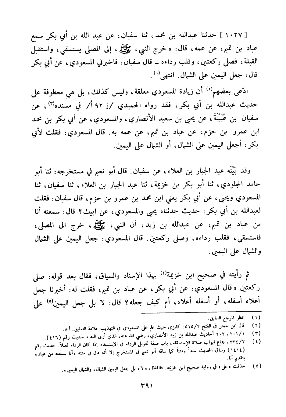 ادّعى بَعضهم أَن زِيَادَة المَسْعُودِيّ معلقَة وَلَيْسَ كَذَلِك بل هِيَ معطوفة على حَدِيث عبد الله بن أبي بكر فقد رَوَاهُ الْحميدِي ز 92 أفِي مُسْنده عَن سُفْيَان بن عُيَيْنَةَ عَنْ يَحْيَى بْنِ سَعِيدٍ الْأنْصَارِيّ والمسعودي عَنْ أَبِي بَكْرِ بْنِ مُحَمَّدِ ابْن عَمْرو بن حزم عَن عباد بن تَمِيم عَن عَمه بِهِ قَالَ المَسْعُودِيّ فَقلت لأبي بكر أجعَل الْيَمين على الشمَال أَو الشمَال على الْيَمين