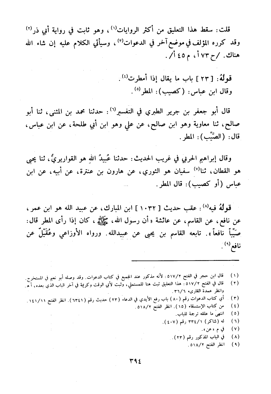 قَوْله فِيهِ عَقِبَ حَدِيثِ [1032] ابْنِ الْمُبَارَكِ عَنْ عُبَيْدِ اللَّهِ هُوَ ابْنُ عُمَرَ عَنْ نَافِعٍ عَنِ الْقَاسِمِ عَنْ عَائِشَةُ ((أَنَّ رَسُولَ اللَّهِ صَلَّى اللَّهُ عَلَيْهِ وَسَلَّمَ كَانَ إِذَا رَأَى الْمَطَرَ قَالَ صَيِّبًا نَافِعًا)) تَابعه الْقَاسِم بن يحيى عَن عبيد الله وَرَوَاهُ الْأَوْزَاعِيّ وَعقيل عَن نَافِع