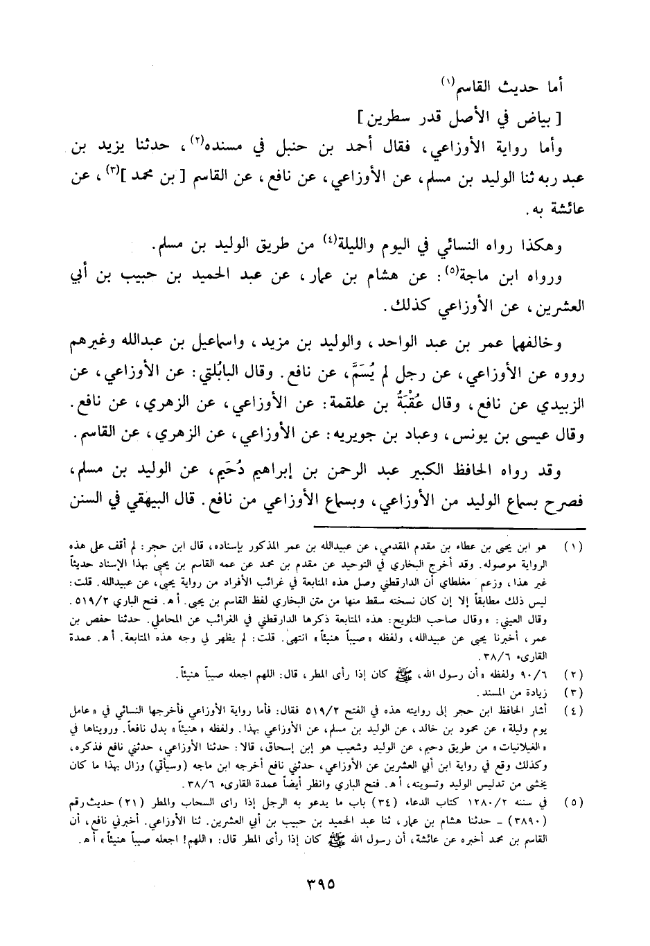 وَأما رِوَايَة الْأَوْزَاعِيّ فَقَالَ أَحْمد بن حَنْبَل فِي مُسْنده حَدَّثنا يَزِيدُ بْنُ عبد ربه ثَنَا الْوَلِيد بن مُسلم عَن الْأَوْزَاعِيّ عَن نَافِع عَن الْقَاسِم [بن مُحَمَّد] عَن عَائِشَة بِهِ