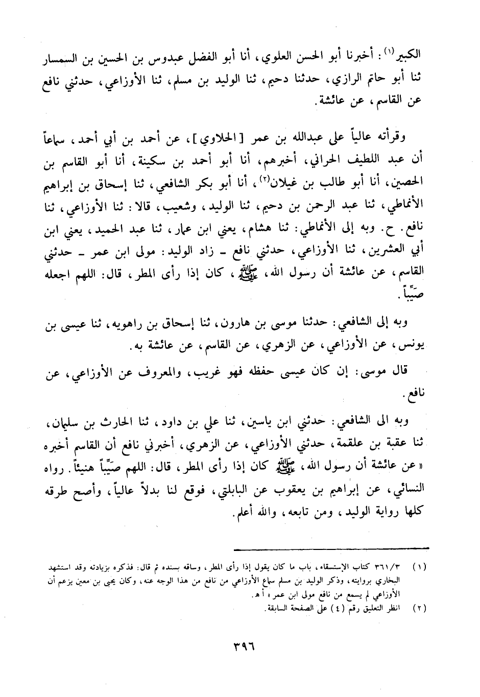 وَقَرَأْتُهُ عَالِيًا عَلَى عَبْدِ اللَّهِ بْنِ عُمَرَ [الْحَلاوِيِّ] عَنْ أَحْمَدَ بْنِ أَبِي أَحْمَدَ سَمَاعًا أَنَّ عَبْدَ اللَّطِيفِ الْحَرَّانِيَّ أَخْبَرَهُمْ أَنا أَبُو أَحْمد بن سكينَة أَنا أَبُو الْقَاسِم بن الْحصين أَنا أَبُو طَالب بن غيلَان أَنا أَبُو بَكْرٍ الشَّافِعِيُّ ثَنَا إِسْحَاقُ بْنُ إِبْرَاهِيمَ الأَنْمَاطِيُّ ثَنَا عَبْدُ الرَّحْمَنِ بْنُ دُحَيْمٍ ثَنَا الْوَلِيدُ وَشُعَيْبٌ قَالا ثَنَا الأَوْزَاعِيُّ ثَنَا نَافِع ح وَبِهِ إِلَى الأَنْمَاطِيِّ ثَنَا هِشَامٌ يَعْنِي ابْنَ عَمَّارٍ ثَنَا عَبْدُ الْحَمِيدِ يَعْنِي ابْنَ أَبِي الْعِشْرِينَ ثَنَا الأَوْزَاعِيُّ حَدَّثَني نَافِع زَادَ الْوَلِيدُ مَوْلَى ابْنِ عُمَرَ حَدَّثَني الْقَاسِمُ عَنْ عَائِشَةُ أَنَّ رَسُولَ اللَّهِ صَلَّى اللَّهُ عَلَيْهِ وَسَلَّمَ كَانَ إِذَا رَأَى الْمَطَرَ قَالَ اللَّهُمَّ اجْعَلْهُ صَيِّبًا