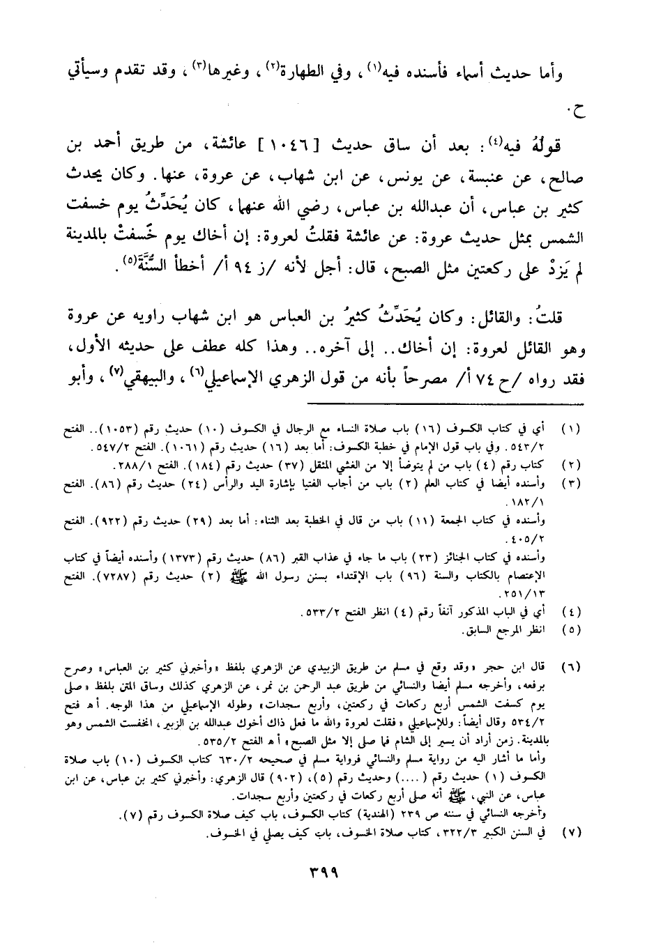 قَوْله فِيهِ بعد أَن سَاق حَدِيث [1046] عَائِشَة من طَرِيق أَحْمد بن صَالح عَن عَنْبَسَة عَن يُونُس عَن ابْن شهَاب عَن عُرْوَة عَنْهَا وَكَانَ يحدث كثير بن عَبَّاس أَن عبد الله بن عَبَّاس رَضِي الله عَنْهُمَا كَانَ يحدث يَوْم خسفت الشَّمْس بِمثل حَدِيث عُرْوَة عَن عَائِشَة فَقلت لعروة إِن أَخَاك يَوْم خسفت بِالْمَدِينَةِ لم يزدْ على رَكْعَتَيْنِ مثل الصُّبْح قَالَ أجل لِأَنَّهُ ز 94 أأَخطَأ السّنة