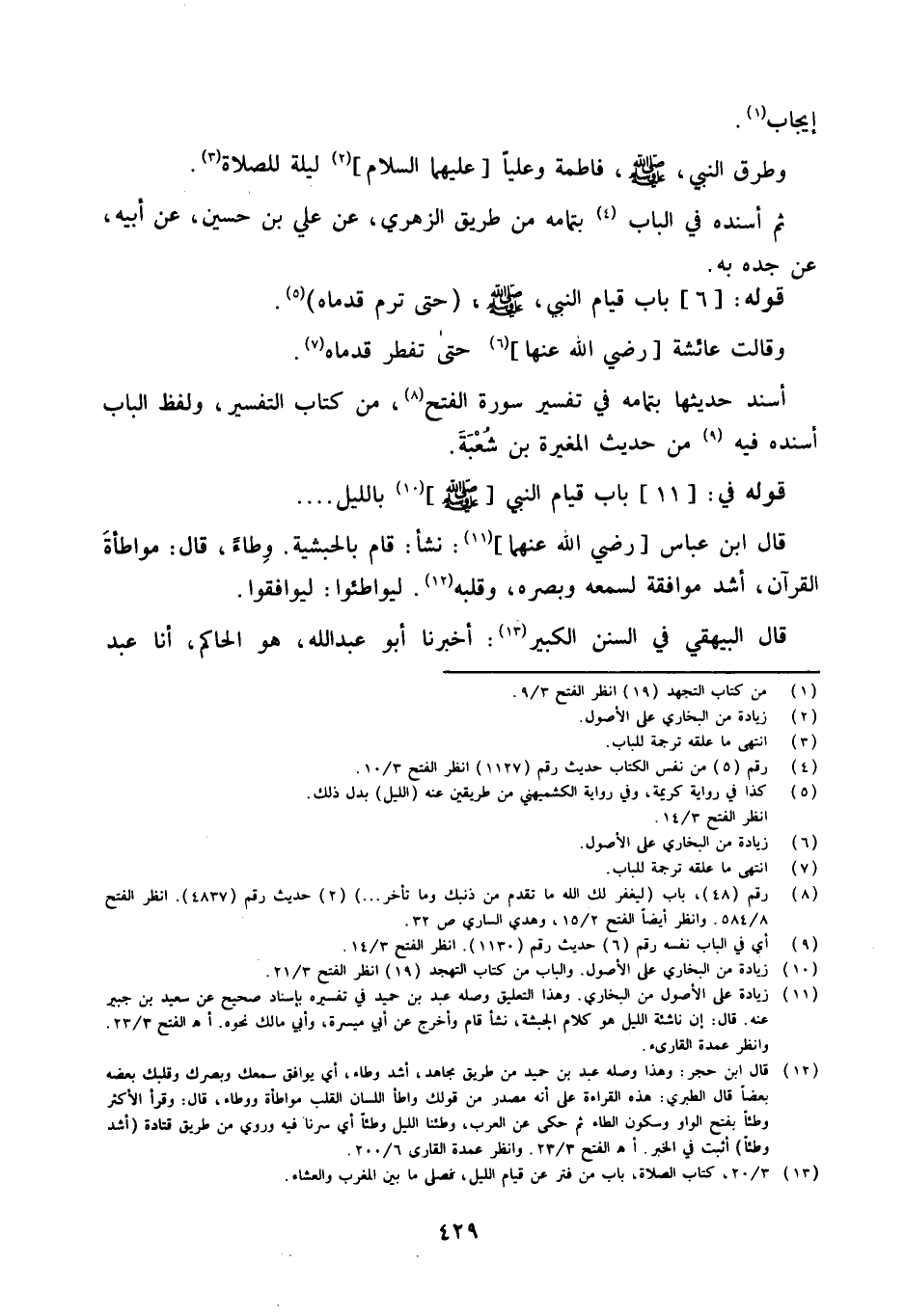 وطرق النَّبِي صلى الله عَلَيْهِ وَسلم فَاطِمَة وعليا [عَلَيْهِمَا السَّلَام] لَيْلَة للصَّلَاة