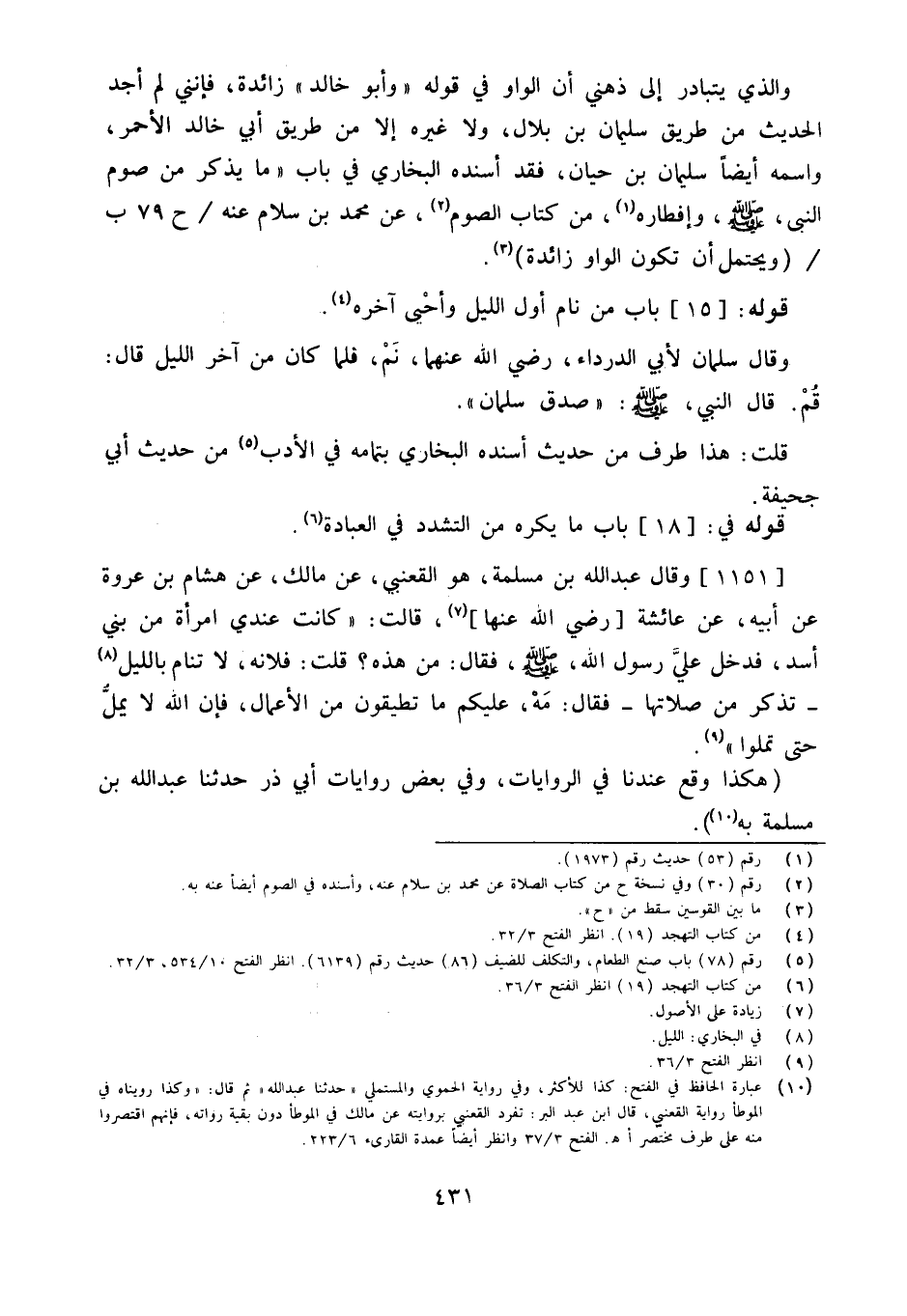 وَالَّذِي يتَبَادَر إِلَى ذهني أَن الْوَاو فِي قَوْله ((وَأَبُو خَالِد)) زَائِدَة فإنني لم أجد الحَدِيث من طَرِيق سُلَيْمَان بن بِلَال وَلَا غَيره إِلَّا من طَرِيق أبي خَالِد الْأَحْمَر واسْمه أَيْضا سُلَيْمَان بن حَيَّان فقد أسْندهُ البُخَارِيّ فِي