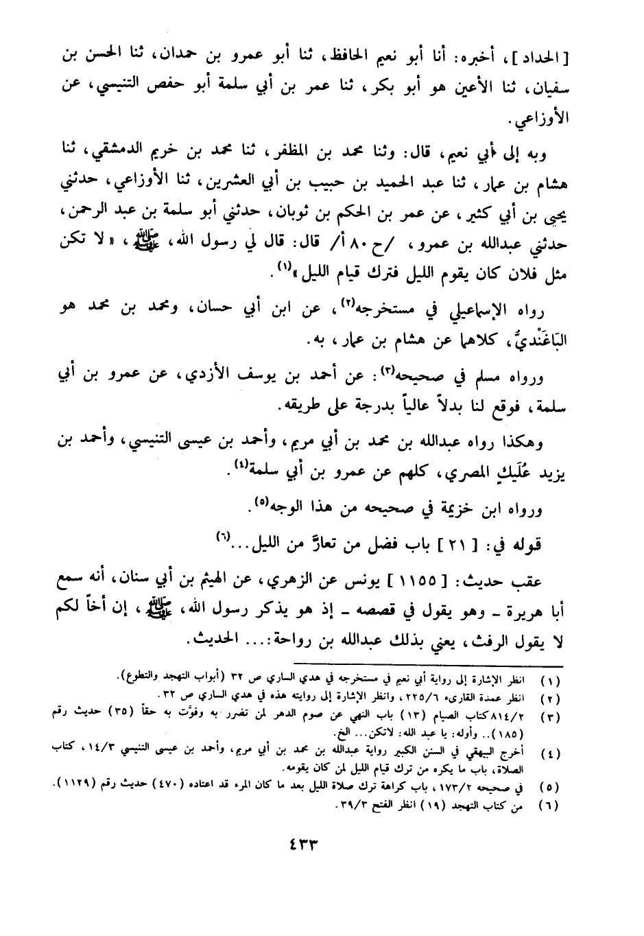 وَبِهِ إِلَى أَبِي نُعَيْمٍ قَالَ وَثنا مُحَمَّدُ بْنُ الْمُظَفَّرِ ثَنَا مُحَمَّدُ بْنُ خُرَيْمٍ الدِّمَشْقِيُّ ثَنَا هِشَامُ بْنُ عَمَّارٍ ثَنَا عَبْدُ الحميد بن حبيب بن أبي الْعِشْرِينَ ثَنَا الأَوْزَاعِيُّ حَدَّثَني يَحْيَى بْنُ أَبِي كَثِيرٍ عَنْ عَمْرِو بْنِ الْحَكَمِ بْنِ ثَوْبَانَ حَدَّثَني أَبُو سَلمَة بن عبد الرَّحْمَن حَدَّثَني عَبْدُ اللَّهِ بْنُ عَمْرِو ح 80 أقَالَ قَالَ لِي رَسُولُ اللَّهِ صَلَّى اللَّهُ عَلَيْهِ وَسَلَّمَ ((لَا تَكُنْ مِثْلَ فُلانٍ كَانَ يَقُومُ اللَّيْلَ فَتَرَكَ قِيَامَ اللَّيْلِ))