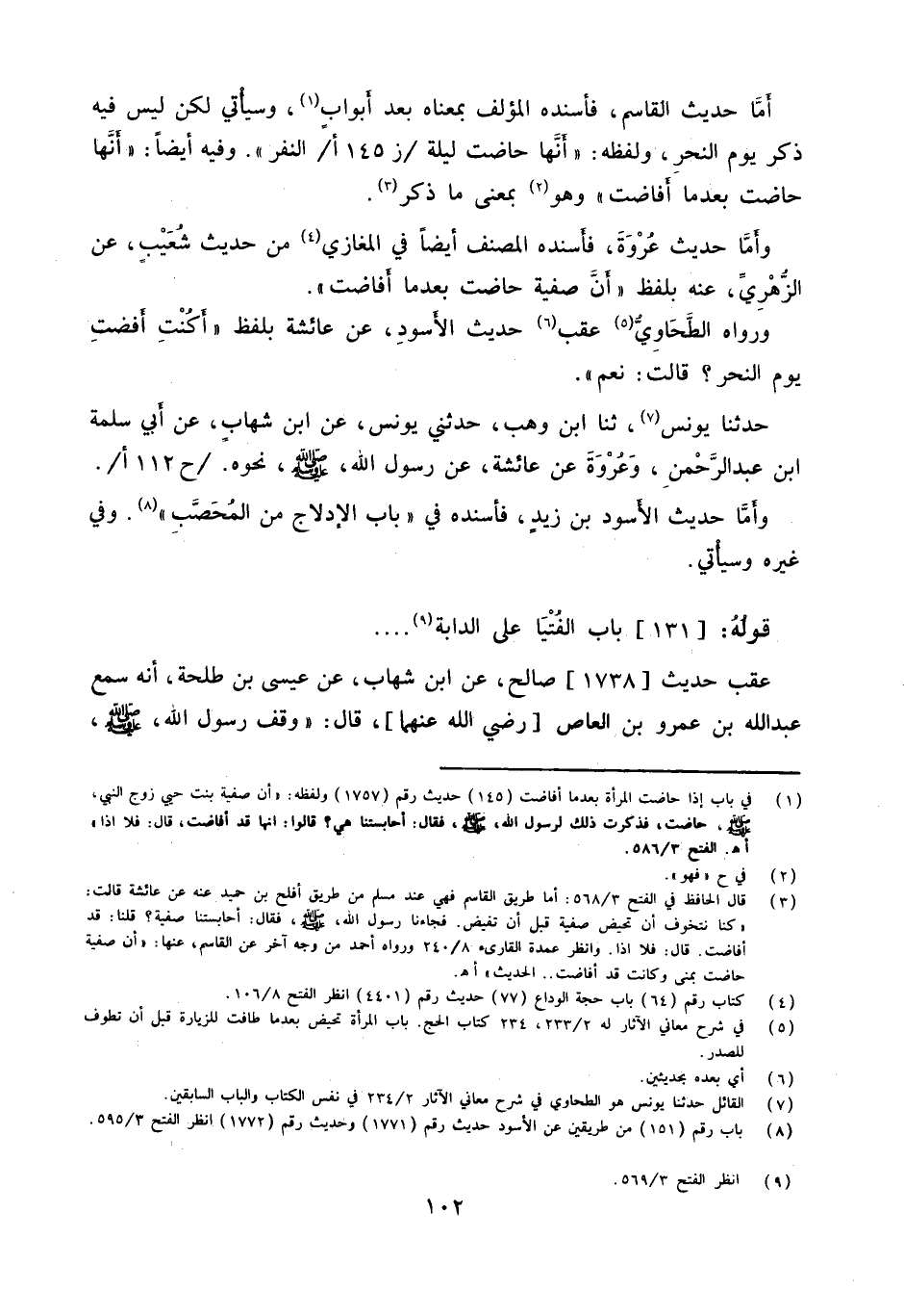 أما حَدِيث الْقَاسِم فأسنده الْمُؤلف بِمَعْنَاهُ بعد أَبْوَاب وَسَيَأْتِي لَكِن لَيْسَ فِيهِ ذكر يَوْم النَّحْر وَلَفظه أَنَّهَا حَاضَت لَيْلَة النَّفر وَفِيه أَيْضا أَنَّهَا حَاضَت بَعْدَمَا أفاضت وَهُوَ بِمَعْنى مَا ذكر
