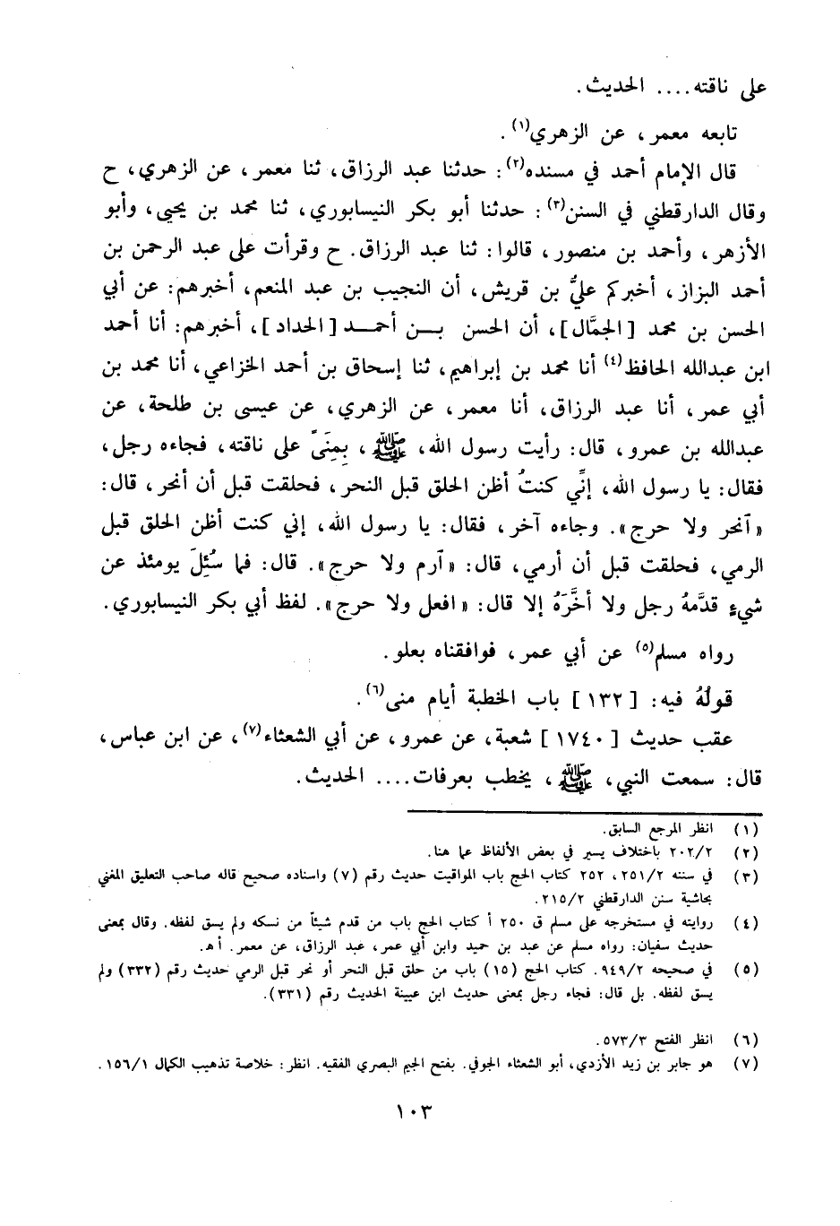 قَالَ الإِمَام أَحْمد فِي مُسْنده حَدثنَا عَبْدُ الرَّزَّاقِ ثَنَا مَعْمَرٌ عَنِ الزُّهْرِيِّ ح وَقَالَ الدَّارَقُطْنِيّ فِي السّنَن حَدَّثنا أَبُو بَكْرٍ النَّيْسَابُورِيُّ ثَنَا مُحَمَّدُ بْنُ يَحْيَى وَأَبُو الأَزْهَرِ وَأَحْمَدُ بْنُ مَنْصُورٍ قَالُوا ثَنَا عَبْدُ الرَّزَّاقِ ح وَقرأت عَلَى عَبْدِ الرَّحْمَن بن أَحْمد الْبَزَّاز أخْبركُم عَلِيُّ بْنُ قُرَيْشٍ أَنَّ النَّجِيبَ بْنَ عَبْدِ الْمُنْعِمِ أَخْبَرَهُمْ عَنْ أَبِي الْحَسَنِ بْنِ مُحَمَّدٍ الْجَمَّالِ أَن الْحسن بن أَحْمد الْحداد أخْبرهُم أَنا أَحْمد بن عبد اللَّهِ الْحَافِظُ أَنا مُحَمَّدُ بْنُ إِبْرَاهِيمَ ثَنَا إِسْحَاقُ بْنُ أَحْمَدَ الْخُزَاعِيُّ أَنا مُحَمَّدُ بْنُ أَبِي عُمَرَ أَنا عَبْدُ الرَّزَّاقِ أَنا مَعْمَرٌ عَنِ الزُّهْرِيِّ عَنْ عِيسَى بْنِ طَلْحَةَ عَنْ عَبْدِ اللَّهِ بْنِ عَمْرٍو قَالَ رَأَيْتُ رَسُولَ الله صلى الله عَلَيْهِ وَسلم بِمِنًى عَلَى نَاقَتِهِ فَجَاءَهُ رَجُلٌ فَقَالَ يَا رَسُول الله إِنِّي كُنْتُ أَظُنُّ الْحَلْقَ قَبْلَ النَّحْرِ فَحَلَقْتُ قَبْلَ أَنْ أَنْحَرَ قَالَ انْحَرْ وَلا حَرَجَ وَجَاءَهُ آخَرُ فَقَالَ يَا رَسُول الله إِنِّي كُنْتُ أَظُنُّ الْحَلْقَ قَبْلَ الرَّمْيِ فَحَلَقْتُ قَبْلَ أَنْ أَرْمِيَ قَالَ ارْمِ وَلا حَرَجَ قَالَ فَمَا سُئِلَ يَوْمَئِذٍ عَنْ شَيْءٍ قَدَّمَهُ رَجُلٌ وَلا أَخَّرَهُ إِلا قَالَ افْعَلْ وَلا حَرَجَ لَفْظُ أَبِي بَكْرٍ النَّيْسَابُورِيِّ