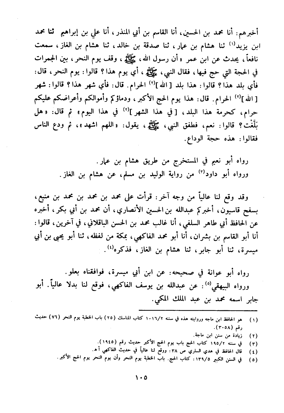 أَخْبَرَهُمْ أَنا مُحَمَّدُ بْنُ الْحُسَيْنِ أَنا الْقَاسِمُ بْنُ أَبِي الْمُنْذِرِ أَنا عَلِيُّ بْنُ إِبْرَاهِيمَ ثَنَا مُحَمَّد ابْن يَزِيدَ ثَنَا هِشَامُ بْنُ عَمَّارٍ ثَنَا صَدَقَةُ بْنُ خَالِدٍ ثَنَا هِشَامُ بْنُ الْغَازِ سَمِعت نَافِعًا يُحَدِّثُ عَنِ ابْنِ عُمَرَ أَنَّ رَسُول الله صلى الله عَلَيْهِ وَسَلَّمَ وَقَفَ يَوْمَ النَّحْرِ بَيْنَ الْجَمَرَاتِ فِي الْحَجَّةِ الَّتِي حَجَّ فِيهَا فَقَالَ النَّبِيُّ صَلَّى اللَّهُ عَلَيْهِ وَسَلَّمَ أَيُّ يَوْمٍ هَذَا قَالُوا يَوْمُ النَّحْرِ قَالَ فَأَيُّ بَلَدٍ هَذَا قَالُوا هَذَا بَلَدُ اللَّهِ الْحَرَامُ قَالَ فَأَيُّ شَهْرٍ هَذَا قَالُوا شَهْرُ اللَّهِ الْحَرَامُ قَالَ هَذَا يَوْمُ الْحَجِّ الأَكْبَرِ وَدِمَاؤُكُمْ وَأَمْوَالُكُمْ وَأَعْرَاضُكُمْ عَلَيْكُمْ حَرَامٌ كَحُرْمَةِ هَذَا الْبَلَدِ فِي هَذَا الشَّهْرِ فِي هَذَا الْيَوْمِ ثُمَّ قَالَ هَلْ بَلَّغْتُ قَالُوا نَعَمْ فَطَفِقَ النَّبِيُّ صَلَّى اللَّهُ عَلَيْهِ وَسَلَّمَ يَقُولُ اللَّهُمَّ اشْهَدْ ثُمَّ وَدَّعَ النَّاسَ فَقَالُوا هَذِهِ حَجَّةُ الْوَدَاعِ