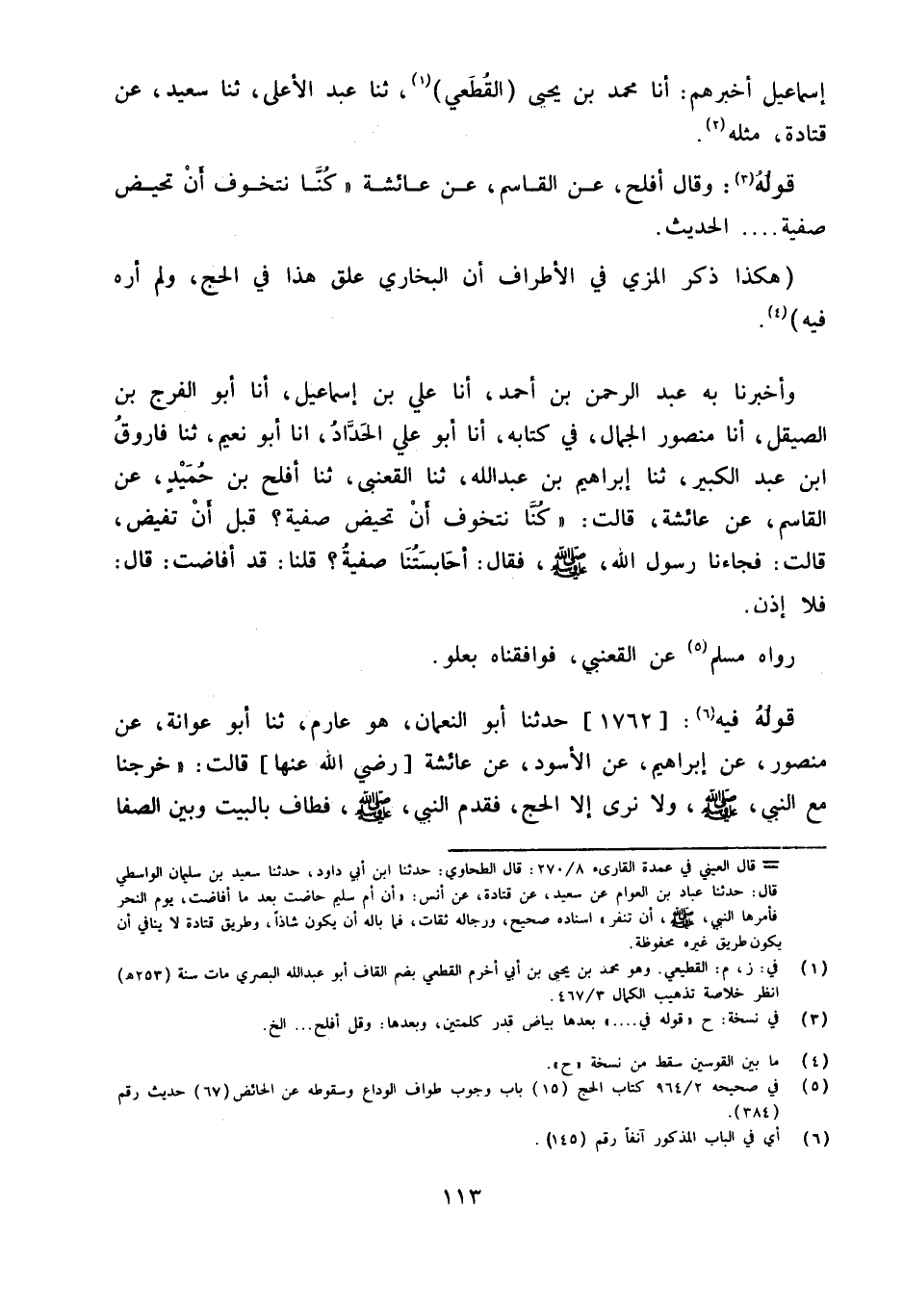 وَقَالَ أَفْلَحُ عَنِ الْقَاسِمِ عَنْ عَائِشَةَ كُنَّا نَتَخَوَّفُ أَنْ تَحِيضَ صَفِيَّةُ الْحَدِيثُ
