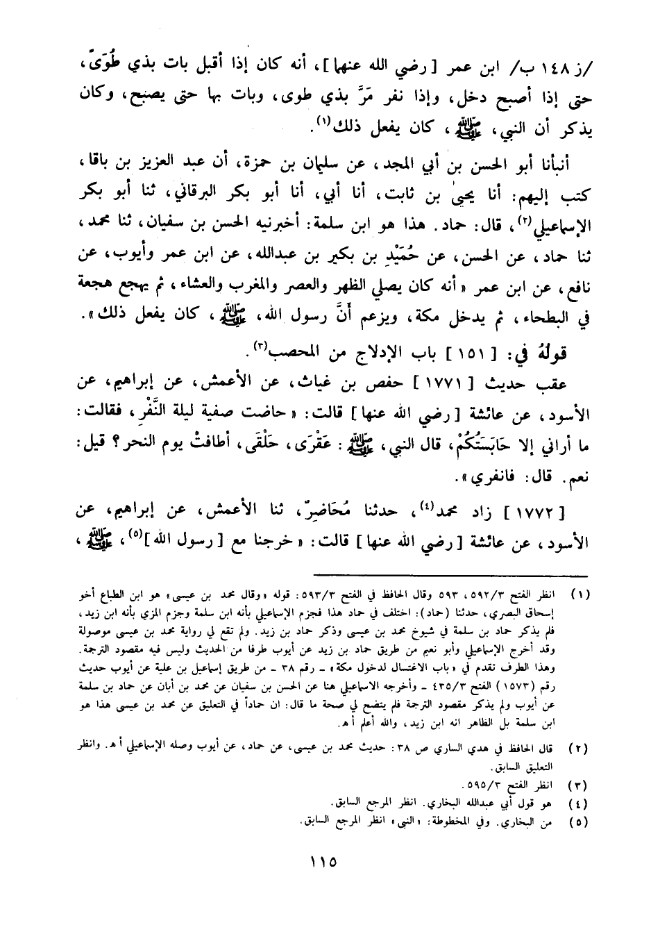 أَنبأَنَا أَبُو الْحَسَنِ بْنُ أَبِي الْمَجْدِ عَنْ سُلَيْمَانَ بْنِ حَمْزَة أَن عبد الْعَزِيز ابْن بَاقَا كَتَبَ إِلَيْهِمْ أَنا يَحْيَى بْنُ ثَابِتٍ أَنا أَبِي أَنا أَبُو بَكْرٍ الْبَرْقَانِيُّ ثَنَا أَبُو بَكْرٍ الإِسْمَاعِيلِيُّ قَالَ حَمَّادٌ هَذَا هُوَ ابْنُ سَلَمَةَ أَخْبَرَنِيهِ الْحَسَنُ ابْن سُفْيَانَ ثَنَا مُحَمَّدُ ثَنَا حَمَّادٌ عَنِ الْحَسَنِ عَنْ حُمَيْدِ بْنِ بُكَيْرِ بْنِ عَبْدِ اللَّهِ عَنِ ابْنِ عُمَرَ وَأَيُّوبَ عَنْ نَافِعٍ عَنِ ابْنِ عُمَرَ أَنَّهُ كَانَ يُصَلِّي الظُّهْرَ وَالْعَصْرَ وَالْمَغْرِبَ وَالْعِشَاءَ ثُمَّ يَهْجَعُ هَجْعَةً فِي الْبَطْحَاءِ ثُمَّ يَدْخُلُ مَكَّةَ وَيَزْعُمُ أَنَّ رَسُول الله صلى الله عَلَيْهِ وَسَلَّمَ كَانَ يَفْعَلُ ذَلِكَ