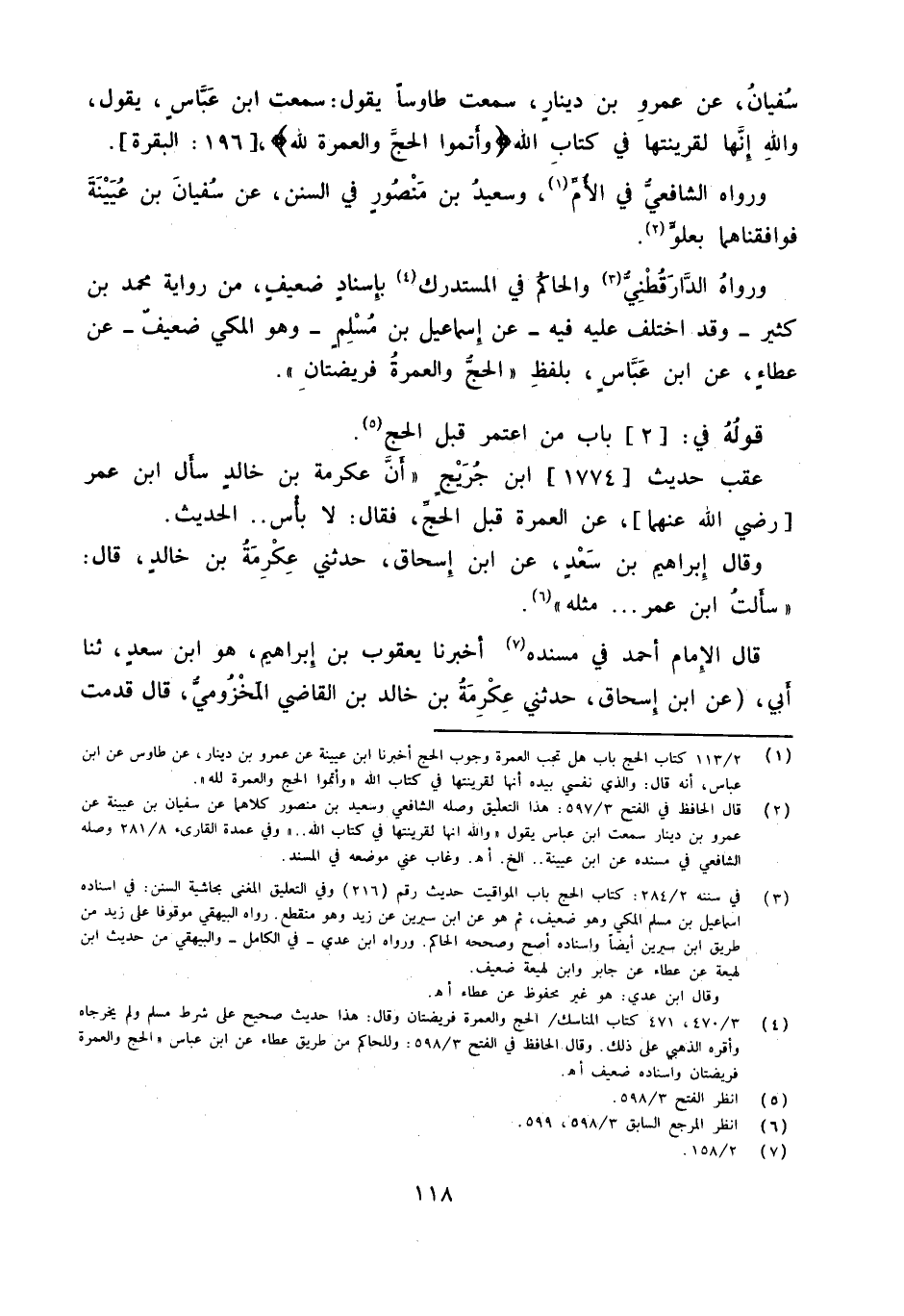 وَرَوَاهُ الدَّارَقُطْنِيّ وَالْحَاكِم فِي الْمُسْتَدْرك بِإِسْنَاد ضَعِيف من رِوَايَة مُحَمَّد بن كثير وَقد اخْتلف عَلَيْهِ فِيهِ عَنْ إِسْمَاعِيلَ بْنِ مُسْلِمٍ وَهُوَ الْمَكِّيُّ ضَعِيفٌ عَنْ عَطَاءٍ عَنِ ابْنِ عَبَّاسٍ بِلَفْظِ الْحَجُّ وَالْعُمْرَةُ فَرِيضَتَانِ