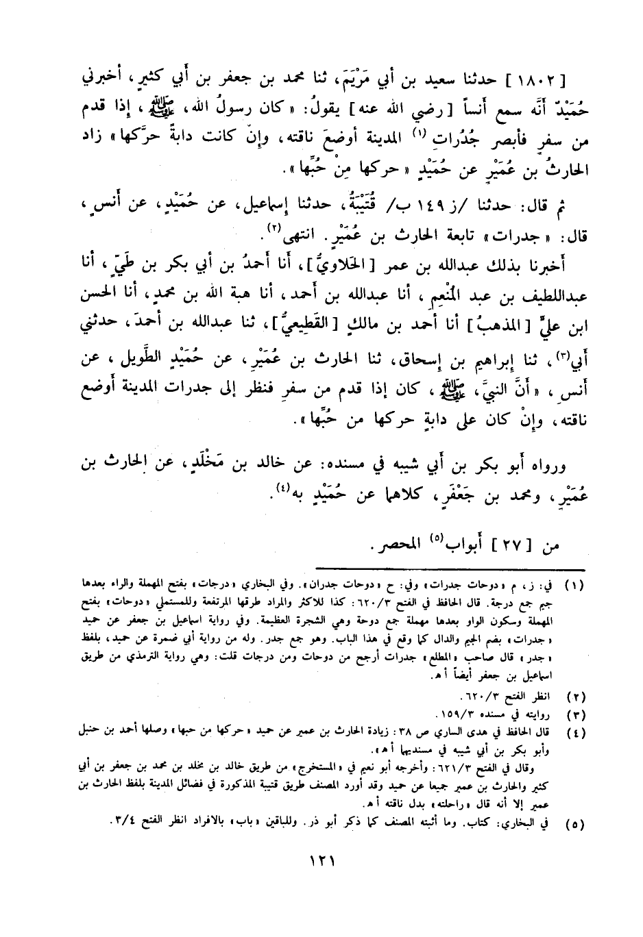 أخبرنَا بِذَلِكَ عَبْدُ اللَّهِ بْنُ عُمَرَ الْحَلاوِيُّ أَنا أَحْمد بن أبي بكر بن طَيٍّ أَنا عَبْدُ اللَّطِيفِ بْنُ عَبْدِ الْمُنْعِمِ أَنا عَبْدُ اللَّهِ بْنُ أَحْمَدَ أَنا هِبَةُ اللَّهِ بن مُحَمَّد أَنا الْحسن بن عَلِيٍّ الْمُذْهِبُ أَنا أَحْمَدُ بْنُ مَالِكٍ الْقَطِيعِيُّ ثَنَا عَبْدُ اللَّهِ ابْن أَحْمَدَ حَدَّثَنِي أَبِي ثَنَا إِبْرَاهِيمُ بْنُ إِسْحَاقَ ثَنَا الْحَارِثُ بْنُ عُمَيْرٍ عَنْ حُمَيْدٍ الطَّوِيلِ عَنْ أَنَسٍ أَنَّ النَّبِيَّ صَلَّى اللَّهُ عَلَيْهِ وَسَلَّمَ كَانَ إِذَا قَدِمَ مِنْ سَفَرٍ فَنَظَرَ إِلَى جُدُرَاتِ الْمَدِينَةِ أَوْضَعَ نَاقَتَهُ وَإِنْ كَانَ عَلَى دَابَّةٍ حَرَّكَهَا مِنْ حُبِّهَا