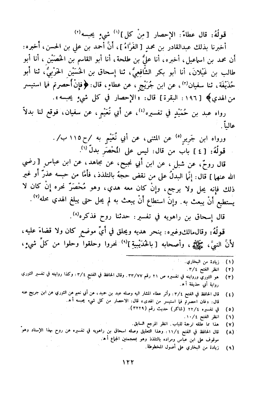 أخبرنَا بذلك عبد الْقَادِر بن مُحَمَّد الْفراء أَنَّ أَحْمَدَ بْنَ عَلِيِّ بْنِ الْحسن أخبرهُ أَن مُحَمَّد بن إِسْمَاعِيل أخبرهُ أَنا عَليّ بن طَلْحَة أَنا أَبُو الْقَاسِم ابْن الْحصين أَنا أَبُو طَالب بن غَيْلانَ أَنا أَبُو بَكْرٍ الشَّافِعِيُّ ثَنَا إِسْحَاق ابْن الْحُسَيْن الْحَرْبِيّ ثَنَا أَبُو حُذَيْفَة ثَنَا سُفْيَان عَن ابْن جريج عَن عَطاء قَالَ {فَإِنْ أُحْصِرْتُمْ فَمَا اسْتَيْسَرَ مِنَ الْهَدْيِ} 196 الْبَقَرَة قَالَ الْإِحْصَار فِي كل شَيْء يحْبسهُ