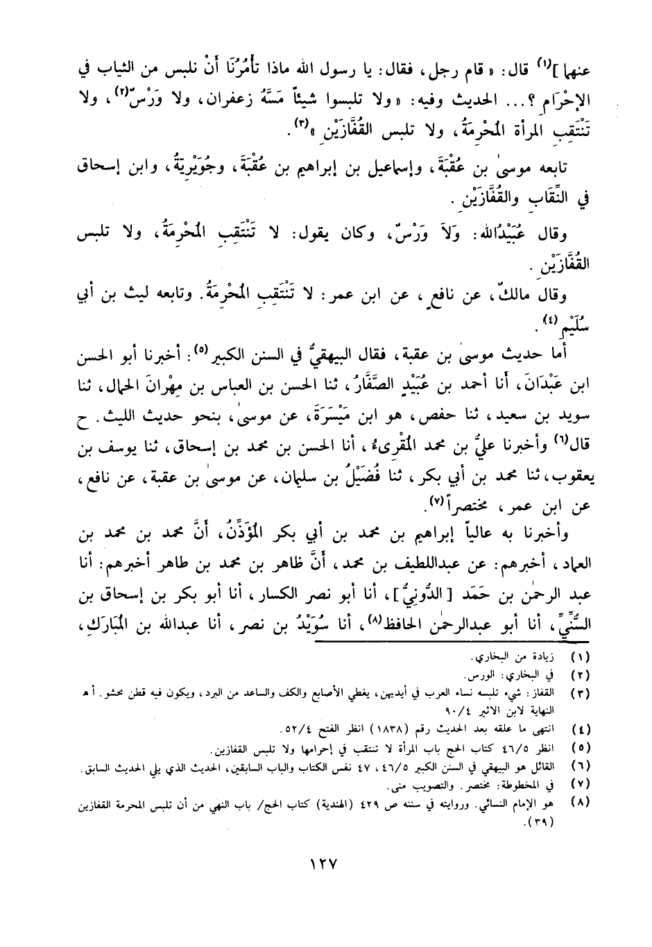 تَابعه مُوسَى بن عقبَة وَإِسْمَاعِيل بن إِبْرَاهِيم بن عقبَة وَجُوَيْرِية وَابْن إِسْحَاق فِي النقاب والقفازين