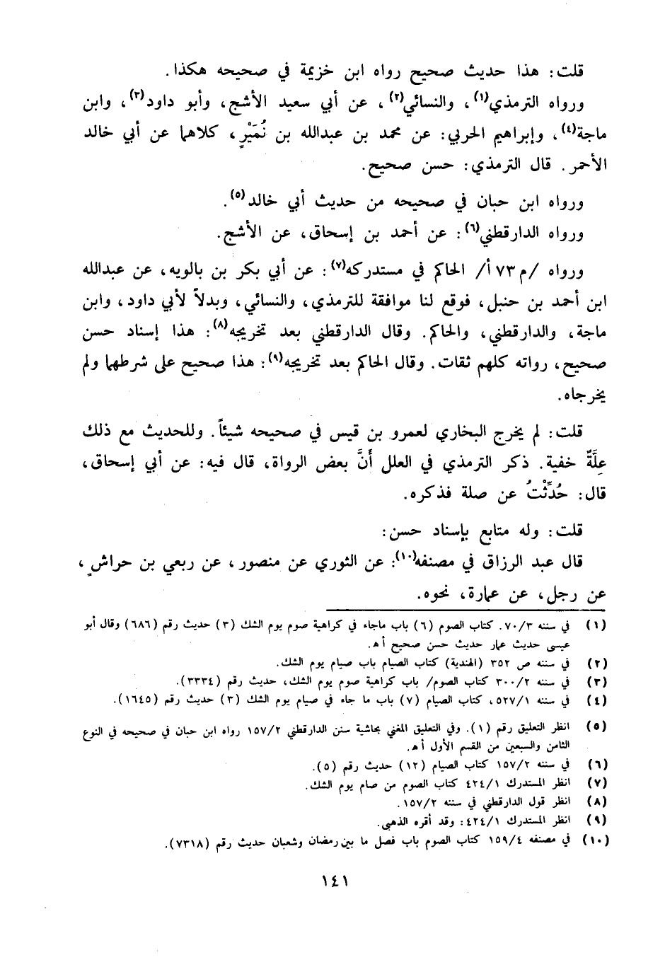 وَرَوَاهُ الْحَاكِم فِي مُسْتَدْركه عَن أبي بكر بن بَالَوَيْهِ عَن عبد الله بن أَحْمد ابْن حَنْبَل فَوَقع لنا مُوَافقَة لِلتِّرْمِذِي وَالنَّسَائِيّ وبدلا لأبي دَاوُد وَابْن ماجة وَالدَّارَقُطْنِيّ وَالْحَاكِم وَقَالَ الدَّارَقُطْنِيّ بعد تَخْرِيجه هَذَا إِسْنَاد حسن صَحِيح وَرُوَاته كلهم ثِقَات وَقَالَ الْحَاكِم بعد تَخْرِيجه هَذَا صَحِيح على شَرطهمَا وَلم يخرجَاهُ
