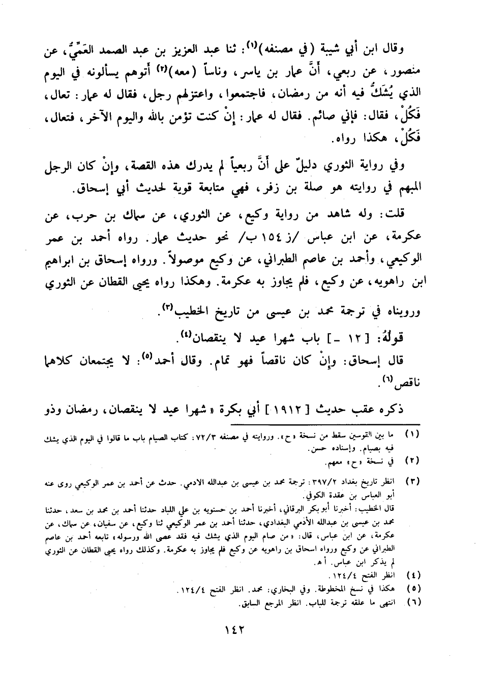 وَقَالَ ابْن أبي شيبَة فِي مُصَنفه ثَنَا عَبْدُ الْعَزِيزِ بْنُ عَبْدِ الصَّمَدِ الْعَمِّيُّ عَنْ مَنْصُورٍ عَنْ رِبْعِيٍّ أَنَّ عَمَّارَ بْنَ يَاسِرٍ وَنَاسًا مَعَهُ أَتَوْهُمْ يَسْأَلُونَهُ فِي الْيَوْمِ الَّذِي يُشَكُّ فِيهِ أَنَّهُ مِنْ رَمَضَانَ فَاجْتَمَعُوا وَاعْتَزَلَهُمْ رَجُلٌ فَقَالَ لَهُ عَمَّارٌ تَعَالَ فَكُلْ فَقَالَ فَإِنِّي صَائِمٌ فَقَالَ لَهُ عَمَّارٌ إِنْ كُنْتَ تُؤْمِنُ بِاللَّهِ وَالْيَوْمِ الآخِرِ فَتَعَالَ فَكُلْ هَكَذَا رَوَاهُ