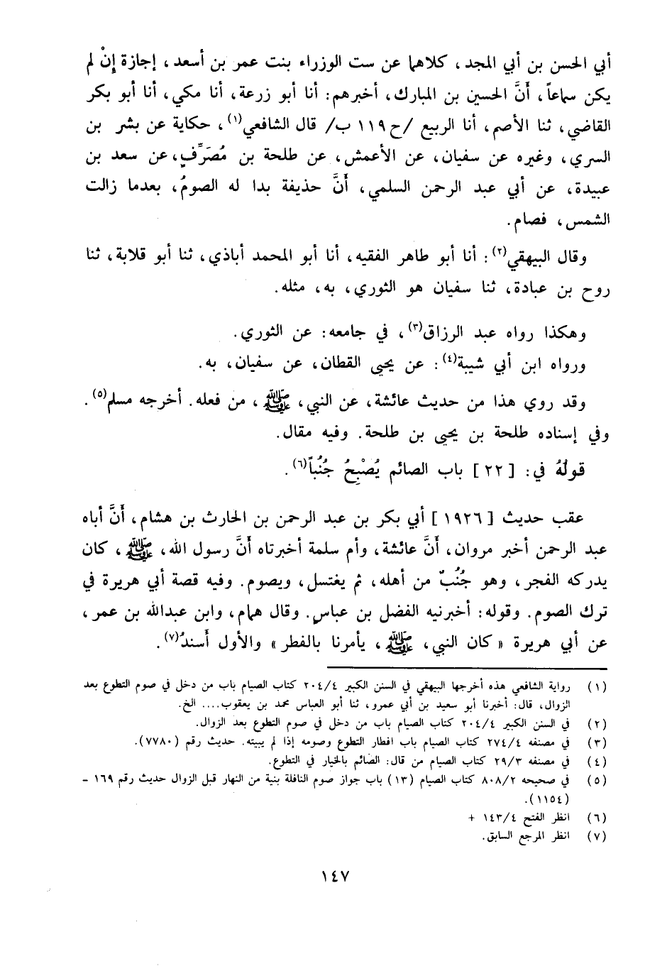 عقب حَدِيث 1926 أبي بكر بن عبد الرَّحْمَن بن الْحَارِث بن هِشَام أَنَّ أَبَاهُ عَبْدَ الرَّحْمَنِ أَخْبَرَ مَرْوَانَ أَنَّ عَائِشَةَ وَأُمَّ سَلَمَةَ أَخْبَرَتَاهُ أَنَّ رَسُولَ اللَّهِ صَلَّى اللَّهُ عَلَيْهِ وَسَلَّمَ كَانَ يُدْرِكُهُ الْفَجْرُ وَهُوَ جُنُبٌ مِنْ أَهْلِهِ ثُمَّ يَغْتَسِلُ وَيَصُومُ وَفِيه قصَّة أبي هُرَيْرَة فِي ترك الصَّوْم وَقَوله أخبرنيه الْفضل بن عَبَّاس وَقَالَ همام وَابْن عبد الله بن عمر عَن أبي هُرَيْرَة كَانَ النَّبِي صلى الله عَلَيْهِ وَسلم يَأْمُرنَا بِالْفطرِ وَالْأول أسْند