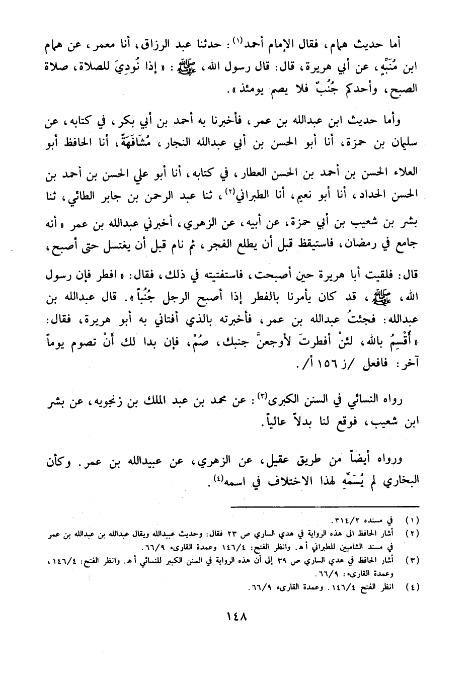 وَأما حَدِيث ابْن عبد الله بن عمر فَأخبرنا بِهِ أَحْمد بن أبي بكر فِي كِتَابه عَن سُلَيْمَان بن حَمْزَةَ أَنا أَبُو الْحَسَنِ بْنُ أَبِي عَبْدِ اللَّهِ النَّجَّارُ مُشَافَهَةً أَنا الْحَافِظُ أَبُو الْعَلاءِ الْحَسَنُ بْنُ أَحْمَدَ بْنِ الْحَسَنِ الْعَطَّارُ فِي كِتَابه أَنا أَبُو عَليّ الْحَسَنَ بْنَ أَحْمَدَ بْنِ الْحَسَنِ الْحداد أَنا أَبُو نعيم أَنا الطَّبَرَانِيُّ ثَنَا عَبْدُ الرَّحْمَنِ بْنُ جَابِرٍ الطَّائِيُّ ثَنَا بِشْرُ بْنُ شُعَيْب بن أبي حَمْزَة عَن أَبِيهِ عَنِ الزُّهْرِيِّ أَخْبرنِي عَبْدُ اللَّهِ بْنُ عُمَرَ أَنَّهُ جَامَعَ فِي رَمَضَانَ فَاسْتَيْقَظَ قَبْلَ أَنْ يَطْلُعَ الْفَجْرُ ثُمَّ نَامَ قَبْلَ أَنْ يَغْتَسِلَ حَتَّى أَصْبَحَ قَالَ فَلَقِيتُ أَبَا هُرَيْرَةَ حِينَ أَصْبَحْتُ فَاسْتَفْتَيْتُهُ فِي ذَلِكَ فَقَالَ أَفْطِرْ فَإِنَّ رَسُولَ اللَّهِ صَلَّى اللَّهُ عَلَيْهِ وَسَلَّمَ قَدْ كَانَ يَأْمُرُنَا بِالْفِطْرِ إِذَا أَصْبَحَ الرَّجُلُ جُنُبًا قَالَ عَبْدُ اللَّهِ بْنُ عَبْدِ اللَّهِ فَجِئْتُ عَبْدَ اللَّهِ بْنَ عُمَرَ فَأَخْبَرْتُهُ بِالَّذِي أَفْتَانِي بِهِ أَبُو هُرَيْرَةَ فَقَالَ أُقْسِمُ بِاللَّهِ لَئِنْ أَفْطَرْتَ لأَوْجَعَنَّ جَنْبَكَ صُمْ فَإِنْ بَدَا لَكَ أَنْ تَصُومَ يَوْمًا آخَرَ فَافْعَلْ