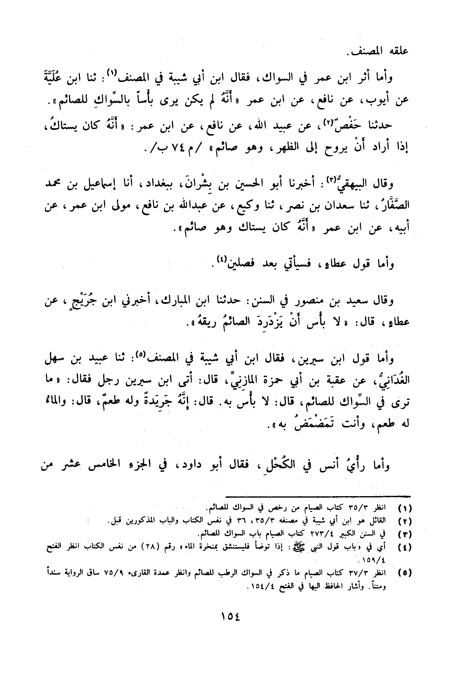 وَأما أثر ابْن عمر فِي السِّوَاك فَقَالَ ابْن أبي شيبَة فِي المُصَنّف ثَنَا ابْنُ عُلَيَّةَ عَنْ أَيُّوبَ عَنِ نَافِعٍ عَنِ ابْنِ عُمَرَ أَنَّهُ لَمْ يَكُنْ يَرَى بَأْسًا بِالسِّوَاكِ للصَّائِم