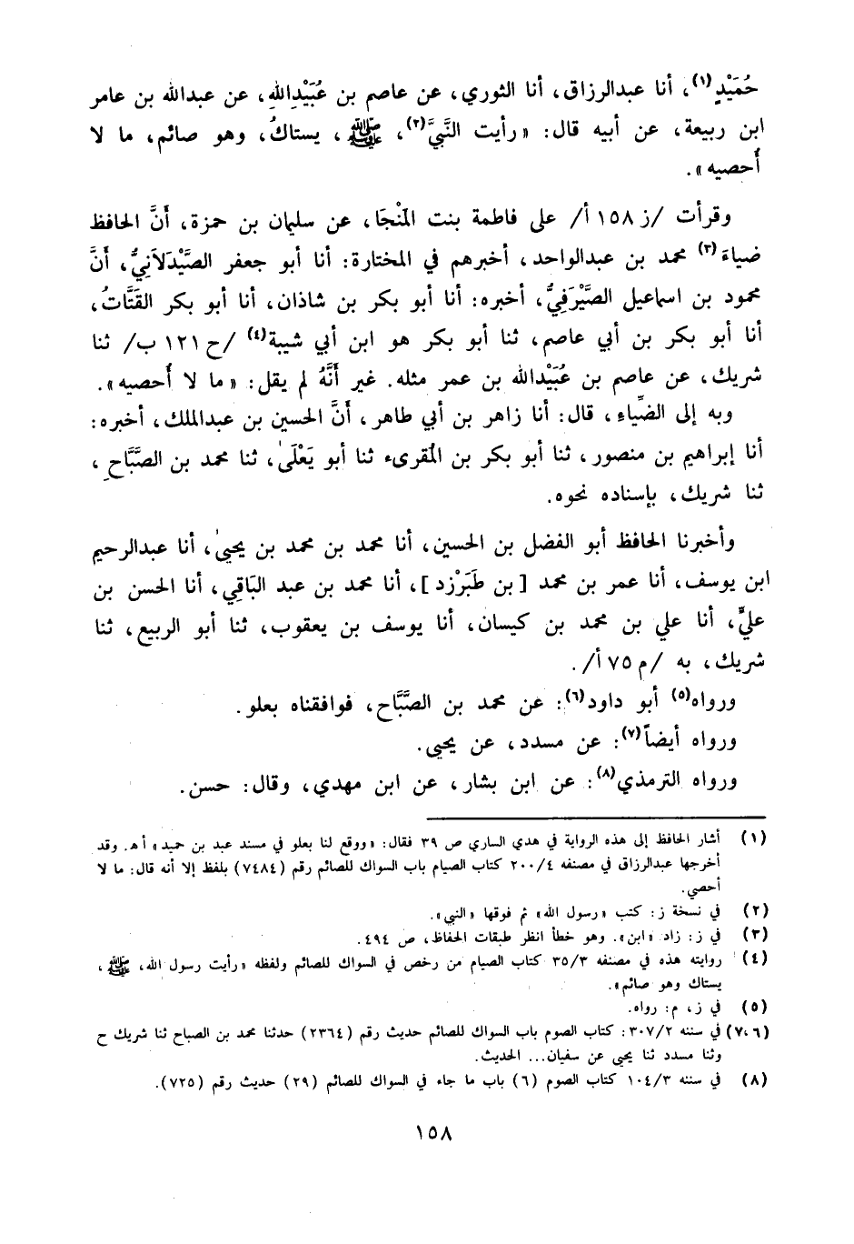 حميد أَنا عبد الرَّزَّاق أَنا الثَّوْريّ عَن عَاصِم بن عبيد الله عَن عبد الله ابْن عَامِرِ بْنِ رَبِيعَةَ عَنْ أَبِيهِ قَالَ رَأَيْتُ النَّبِيَّ صَلَّى اللَّهُ عَلَيْهِ وَسلم يستاك وَهُوَ صَائِم مَا لَا أُحْصِيهِ