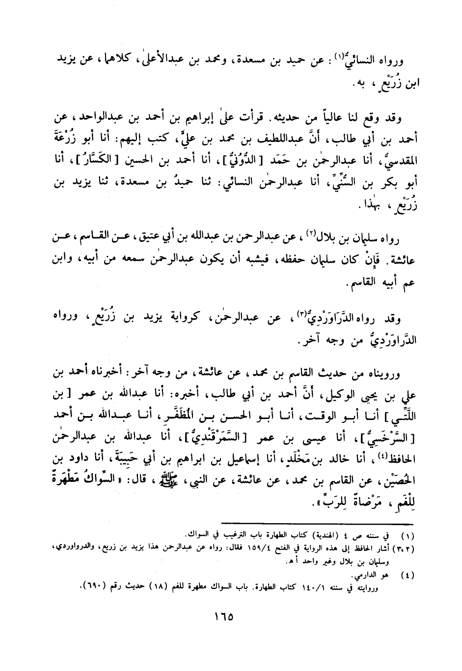 ورويناه من حَدِيث الْقَاسِم بن مُحَمَّد عَن عَائِشَة من وَجه آخر أخبرناه أَحْمد ابْن عَلِيِّ بْنِ يَحْيَى الْوَكِيلُ أَنَّ أَحْمَدَ بْنَ أَبِي طَالِبٍ أَخْبَرَهُ أَنا عَبْدُ اللَّهِ بْنُ عُمَرَ بْنِ اللَّتِّيِّ أَنا أَبُو الْوَقْتِ أَنا أَبُو الْحسن بن المظفر أَنا عَبْدُ اللَّهِ بْنُ أَحْمَدَ السَّرخسِيّ أَنا عِيسَى بن عمر السَّمَرْقَنْدِيُّ أَنا عَبْدُ اللَّهِ بْنُ عَبْدِ الرَّحْمَنِ الْحَافِظُ أَنا خَالِدُ بْنُ مَخْلَدٍ أَنا إِسْمَاعِيلُ بْنُ إِبْرَاهِيمَ بْنِ أَبِي حَبِيبَةَ أَنا دَاوُدُ بْنُ الْحُصَيْنِ عَنِ الْقَاسِمِ بْنِ مُحَمَّدٍ عَنْ عَائِشَةَ عَنِ النَّبِي صلى الله عَلَيْهِ وَسلم قَالَ السِّوَاكُ مَطْهَرَةٌ لِلْفَمِ مَرْضَاةٌ للرب
