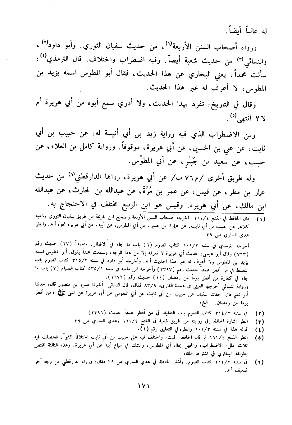وَمن الِاضْطِرَاب الَّذِي فِيهِ رِوَايَة زيد بن أبي أنيسَة لَهُ عَن حبيب بن أبي ثَابت عَن عَليّ بن الْحُسَيْن عَن أبي هُرَيْرَة مَوْقُوفا وَرِوَايَة كَامِل بن الْعَلَاء عَن حبيب عَن سعيد بن جُبَير عَن أبي المطوس
