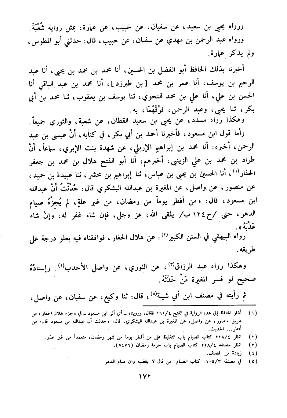 وَأما قَول ابْن مَسْعُود فَأخبرنا أَحْمَدُ بن أبي بكر فِي كِتَابه أَنَّ عِيسَى بْنَ عَبْدِ الرَّحْمَنِ أَخْبَرَهُ أَنا مُحَمَّدُ بْنُ إِبْرَاهِيمَ الإِرْبِلِيُّ عَنْ شُهْدَةَ بِنْتِ الإبرِيِّ سَمَاعًا أَنَّ طِرَادَ بْنَ مُحَمَّدِ بْنِ عَلِيٍّ الزَّيْنَبِيَّ أَخْبَرَهُمْ أَنا أَبُو الْفَتْحِ هِلالُ بْنُ مُحَمَّدِ بْنِ جَعْفَرٍ الْحَفَّارُ أَنا الْحُسَيْنُ بْنُ يَحْيَى بْنِ عَبَّاسٍ ثَنَا إِبْرَاهِيمُ بْنُ مَحْشَرٍ ثَنَا عُبَيْدَةُ بْنُ حُمَيْدٍ عَنْ مَنْصُورٍ عَنْ وَاصِلٍ عَنِ الْمُغِيرَةِ بْنِ عَبْدِ اللَّهِ الْيَشْكُرِيِّ قَالَ حُدِّثْتُ أَنَّ عَبْدِ اللَّهِ بْنِ مَسْعُودٍ قَالَ من أفطر يَوْمًا من رَمَضَان مِنْ غَيْرِ عِلَّةٍ لَمْ يُجْزِهِ صِيَامُ الدَّهْرِ حَتَّى يَلْقَى اللَّهَ عَزَّ وَجَلَّ فَإِنْ شَاءَ غَفَرَ لَهُ وَإِنْ شَاءَ عَذَّبَهُ