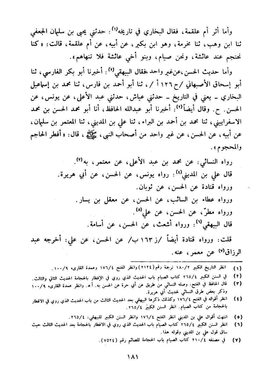 وَأما حَدِيث الْحسن عَن غير وَاحِد فَقَالَ الْبَيْهَقِيّ أخبرنَا أَبُو بَكْرٍ الْفَارِسِيُّ ثَنَا أَبُو إِسْحَاقَ الأَصْبَهَانِيُّ ثَنَا أَبُو أَحْمَدَ بْنُ فَارِسٍ ثَنَا مُحَمَّدُ بْنُ إِسْمَاعِيلَ الْبُخَارِيُّ يَعْنِي فِي التَّارِيخِ حَدَّثَنِي عَيَّاشٌ حَدَّثَنِي عَبْدُ الأَعْلَى عَنْ يُونُسَ عَنِ الْحَسَنِ ح وَقَالَ أَيْضًا أخبرنَا أَبُو عبد الله الْحَافِظ أَنا أَبُو مُحَمَّدٍ الْحَسَنُ بْنُ مُحَمَّدٍ الإِسْفَرَايِينِيُّ ثَنَا مُحَمَّدُ بْنُ أَحْمَدَ بْنِ الْبَرَاءِ ثَنَا عَلِيُّ بْنُ الْمَدِينِيِّ ثَنَا الْمُعْتَمِرُ بْنُ سُلَيْمَانَ عَنْ أَبِيهِ عَنِ الْحَسَنِ عَنْ غَيْرِ وَاحِدٍ مِنْ أَصْحَابِ النَّبِيِّ صَلَّى اللَّهُ عَلَيْهِ وَسَلَّمَ قَالَ أَفْطَرَ الْحَاجِمُ وَالْمَحْجُومُ