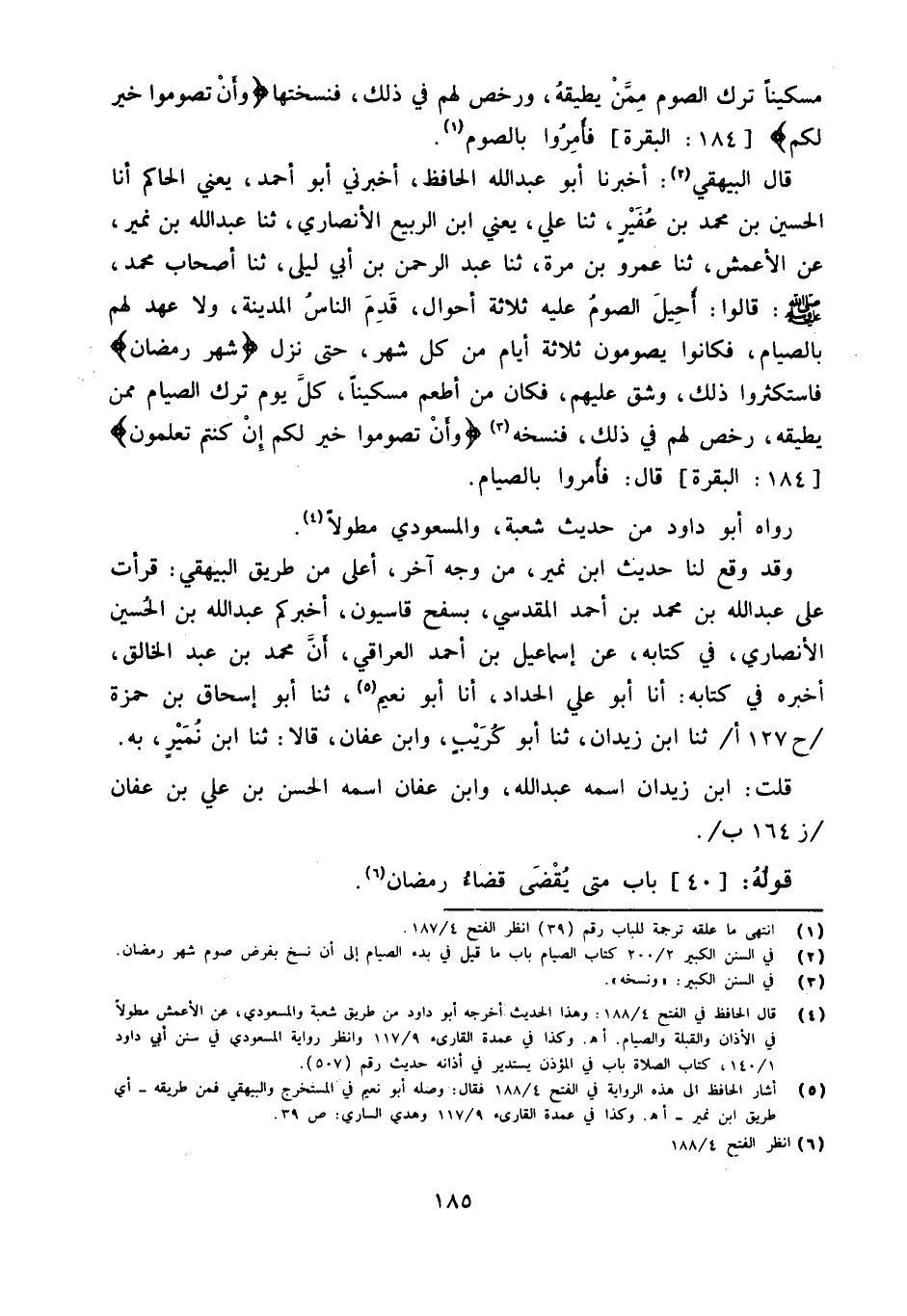 قَالَ البهيقي أخبرنَا عَبْدِ اللَّهِ الْحَافِظُ أَخْبَرَنِي أَبُو أَحْمَدَ يَعْنِي الْحَاكِمَ أَنا الْحُسَيْنُ بْنُ مُحَمَّدِ بْنِ عُفَيْرٍ ثَنَا عَلِيٌّ يَعْنِي ابْنَ الرَّبِيعِ الأَنْصَارِيَّ ثَنَا عَبْدُ اللَّهِ بْنُ نُمَيْرٍ عَنِ الأَعْمَشِ ثَنَا عَمْرُو بْنُ مُرَّةَ ثَنَا عَبْدُ الرَّحْمَنِ بْنُ أَبِي لَيْلَى ثَنَا أَصْحَابُ مُحَمَّدٍ صَلَّى اللَّهُ عَلَيْهِ وَسَلَّمَ قَالُوا أُحِيلَ الصَّوْمُ عَلَيْهِ ثَلاثَةَ أَحْوَالٍ قَدِمَ النَّاسُ الْمَدِينَةَ وَلا عَهْدَ لَهُمْ بِالصِّيَامِ فَكَانُوا يَصُومُونَ ثَلاثَةَ أَيَّامٍ مِنْ كُلِّ شَهْرٍ حَتَّى نزل {شهر رَمَضَان} فَاسْتَكْثَرُوا ذَلِكَ وَشَقَّ عَلَيْهِمْ فَكَانَ مَنْ أَطْعَمَ مِسْكِينًا كُلَّ يَوْمٍ تَرَكَ الصِّيَامَ مِمَّنْ يُطِيقُهُ رُخِّصَ لَهُمْ فِي ذَلِكَ فَنَسَخَهُ وَأَنْ تَصُومُوا خَيْرٌ لَكُمْ إِنْ كُنْتُمْ تَعْلَمُونَ 184 الْبَقَرَة قَالَ فَأُمِرُوا بِالصِّيَامِ