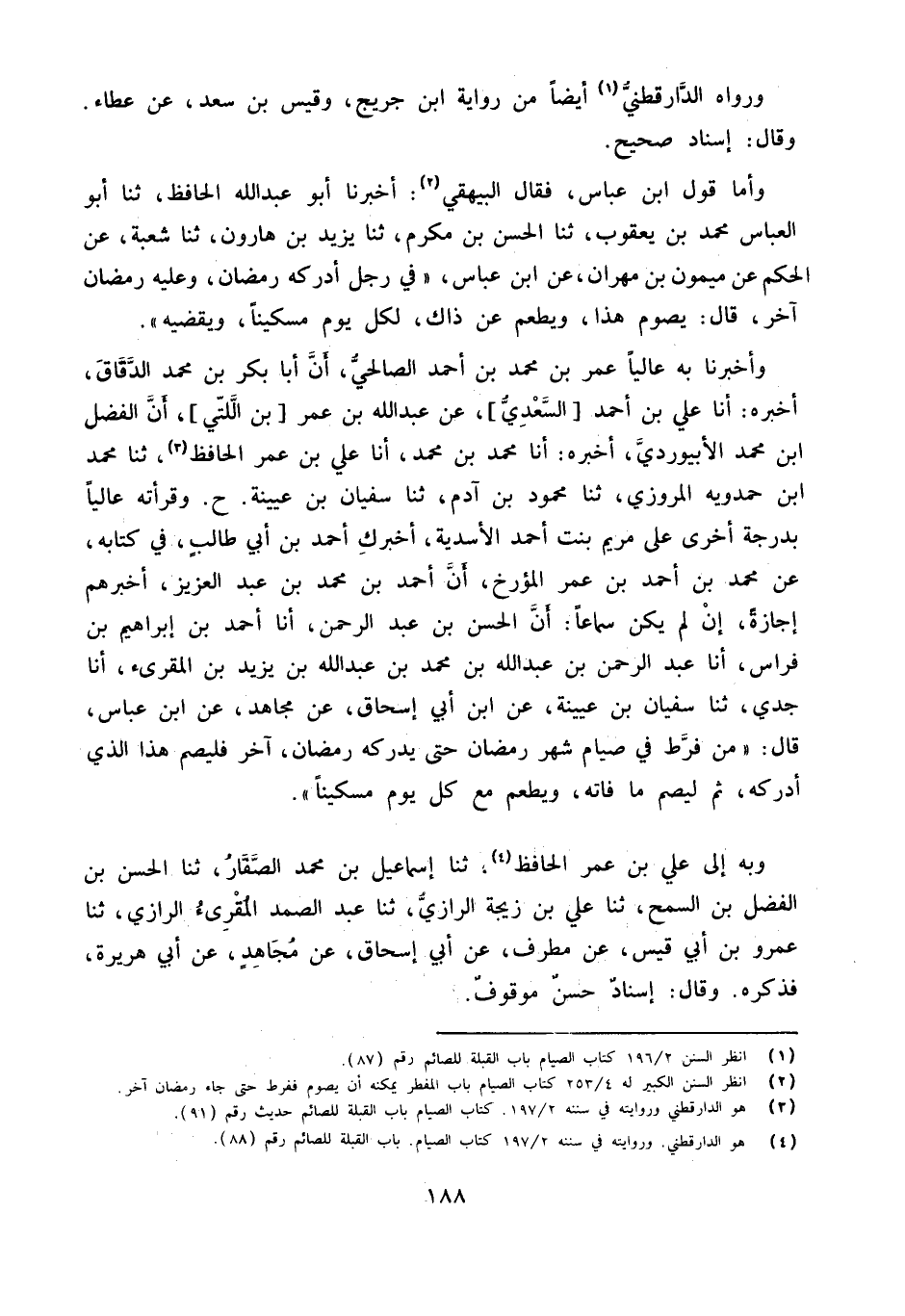 وَأخبرنا بِهِ عَالِيًا عُمَرُ بْنُ مُحَمَّدِ بْنِ أَحْمَدَ الصَّالِحِيُّ أَنَّ أَبَا بَكْرِ بْنَ مُحَمَّدٍ الدَّقَّاقَ أَخْبَرَهُ أَنا عَلِيُّ بْنُ أَحْمَدَ السَّعْدِيُّ عَن عبد الله بن عمر بن اللتي أَن الْفضل بن مُحَمَّد الأبيوردي أخبرهُ أَنا مُحَمَّد بْنُ مُحَمَّدٍ أَنا عَلِيُّ بْنُ عُمَرَ الْحَافِظُ ثَنَا مُحَمَّدُ بْنُ حَمْدَوَيْهِ الْمَرْوَزِيُّ ثَنَا مَحْمُودُ بْنُ آدَمَ ثَنَا سُفْيَانُ بْنُ عُيَيْنَةَ ح قَرَأْتُهُ عَالِيًا بِدَرَجَةٍ أُخْرَى عَلَى مَرْيَمَ بِنْتِ أَحْمَدَ الأَسَدِيَّةِ أَخْبَرَكَ أَحْمَدُ بْنُ أَبِي طَالِبٍ فِي كِتَابه عَن مُحَمَّد بن أَحْمَدَ بْنِ عُمَرَ الْمُؤَرِّخُ أَنَّ أَحْمد بن مُحَمَّد بن عبد الْعَزِيزِ أَخْبَرَهُمْ إِجَازَةً إِنْ لَمْ يَكُنْ سَمَاعًا أَنَّ الْحَسَنَ بْنَ عَبْدِ الرَّحْمَنِ أَنا أَحْمَدُ بْنُ إِبْرَاهِيم ابْن فراس أَنا عبد الرَّحْمَن بن عبد الله بن مُحَمَّد بن عَبْدِ اللَّهِ بْنِ يَزِيدَ بْنِ الْمُقْرِئ أَنا جدي ثَنَا سُفْيَان بْنُ عُيَيْنَةَ عَنِ ابْنِ أَبِي إِسْحَاقَ عَنْ مُجَاهِدٍ عَنِ ابْنِ عَبَّاسٍ قَالَ مَنْ فَرَّطَ فِي صِيَامِ شَهْرِ رَمَضَانَ حَتَّى يُدْرِكَهُ رَمَضَانُ آخَرُ فَلْيَصُمْ هَذَا الَّذِي أَدْرَكَهُ ثُمَّ لِيَصُمْ مَا فَاتَهُ وَيُطْعِمْ مَعَ كُلِّ يَوْمٍ مِسْكِينًا