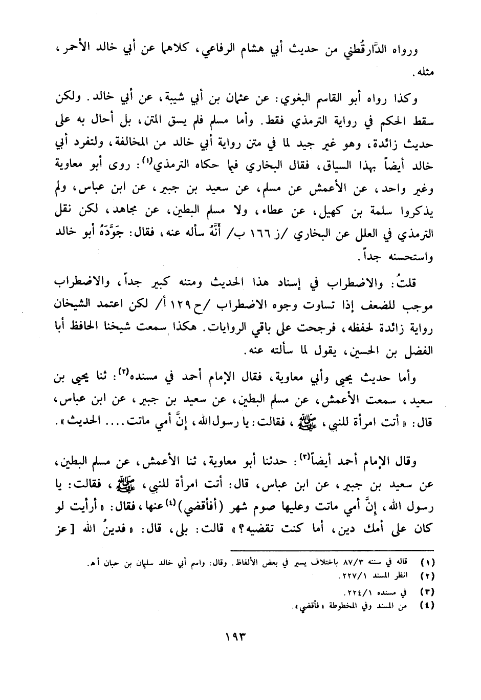 وَأما حَدِيث يحيى وَأبي مُعَاوِيَة فَقَالَ الإِمَام أَحْمد فِي مُسْنده ثَنَا يحيى بن سعيد سَمِعت الْأَعْمَش عَن مُسلم البطين عَنْ سَعِيدِ بْنِ جُبَيْرٍ عَنِ ابْن عَبَّاس قَالَ أَتَت امْرَأَة للنَّبِي صلى الله عَلَيْهِ وَسلم فَقَالَتْ يَا رَسُولَ اللَّهِ إِنَّ أُمِّي مَاتَت الحَدِيث