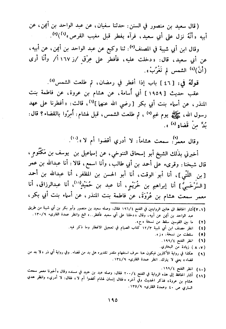 عقب حَدِيثُ 1959 أَبِي أُسَامَةَ عَنْ هِشَامِ بْنِ عُرْوَةَ عَنْ فَاطِمَةَ بِنْتِ الْمُنْذِرِ عَنْ أَسْمَاءَ بِنْتِ أَبِي بَكْرٍ رَضِيَ اللَّهُ عَنْهُمَا قَالَتْ أَفْطَرْنَا عَلَى عَهْدِ رَسُولِ اللَّهِ صَلَّى اللَّهُ عَلَيْهِ وَسَلَّمَ يَوْمَ غَيْمٍ ثُمَّ طَلَعَتِ الشَّمْسُ قيل لهشام أمروا بِالْقضَاءِ قَالَ بُد من قَضَاء