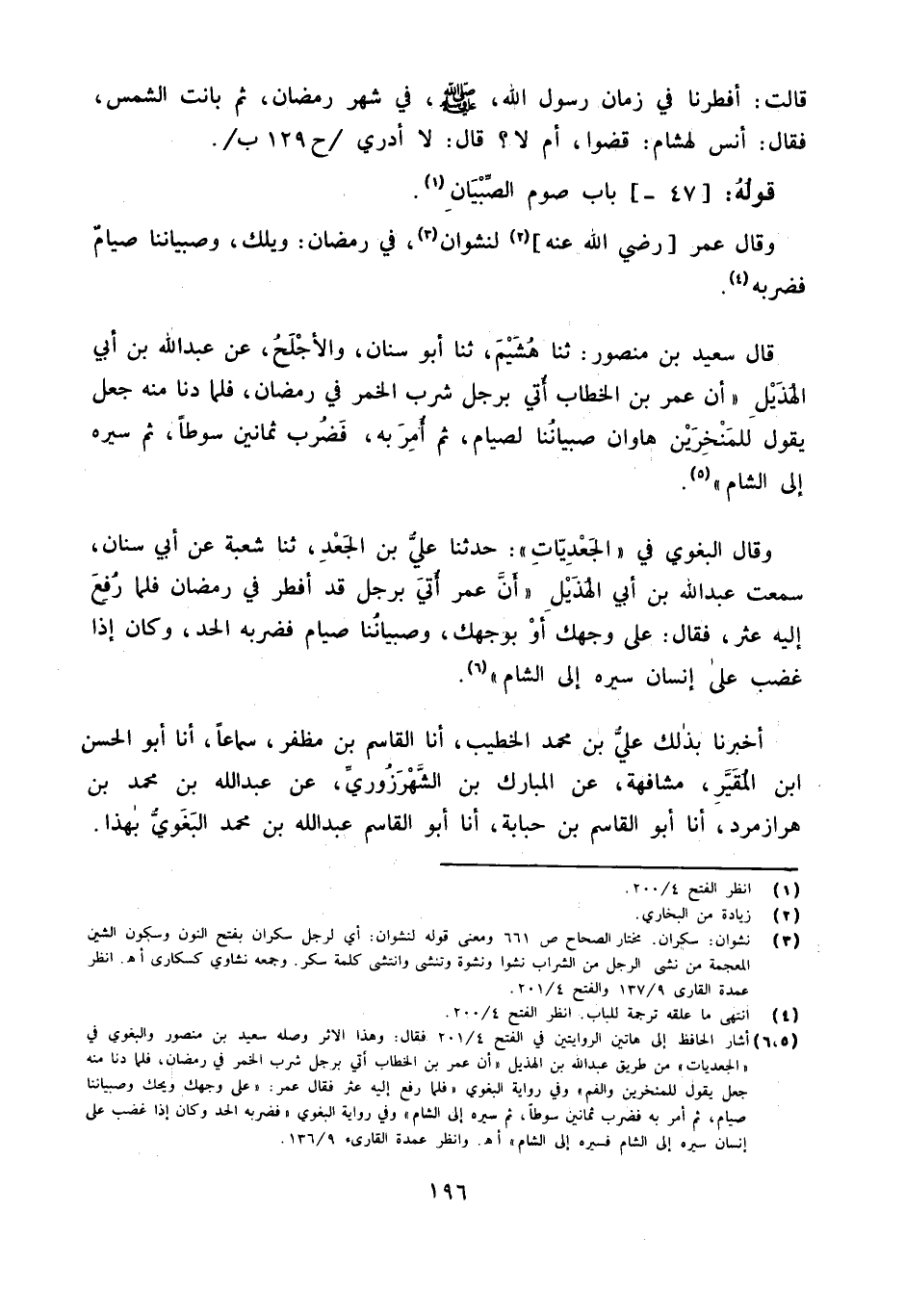 وَقَالَ الْبَغَوِيّ فِي الجعديات حَدثنَا عَلِيُّ بْنُ الْجَعْدِ ثَنَا شُعْبَةُ عَنْ أَبِي سِنَانٍ سَمِعت عَبْدِ اللَّهِ بْنِ أَبِي الْهُذَيْلِ أَنَّ عُمَرَ أُتِيَ بِرَجُلٍ قَدْ أَفْطَرَ فِي رَمَضَانَ فَلَمَّا رُفِعَ إِلَيْهِ عَثَرَ فَقَالَ عَلَى وَجْهِكَ أَوْ بِوَجْهِكَ وَصِبْيَانُنَا صِيَامٌ فَضَرَبَهُ الْحَدَّ وَكَانَ إِذَا غَضِبَ عَلَى إِنْسَانٍ سَيَّرَهُ إِلَى الشَّامِ